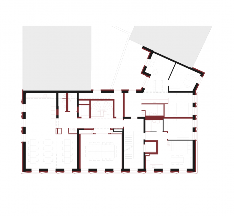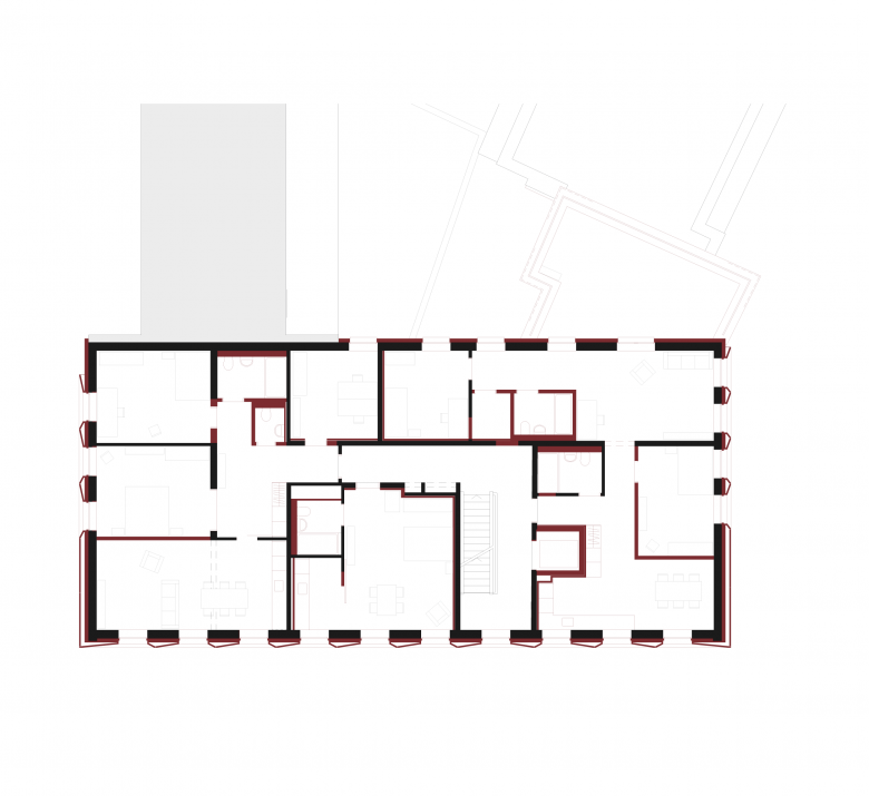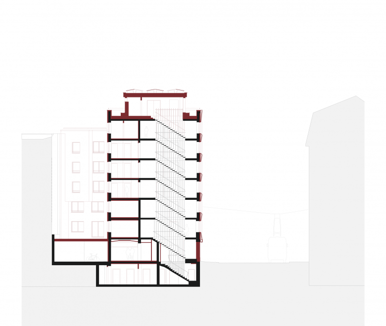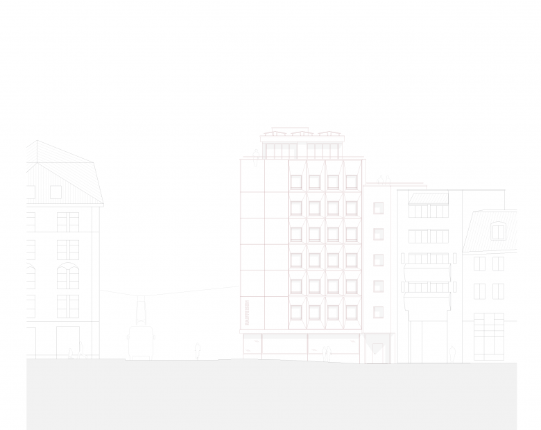 Dem Projektvorschlag liegt das Umbau-Konzept des «massvollen, situativen Eingriffes» zugrunde. Das übergeordnete Ziel ist ein ressourcenschonender Umgang mit der vorhandenen Bausubstanz, welcher mit gezielten Eingriffen eine zukunftsfähige Nutzung ermöglicht. So erfolgt bei der gleichbleibenden Wohnnutzung eine zurückhaltenderer Eingriff, bei der Transformation von Gewerbe- zu Bankspezifischen-Räumen ein intensiverer Eingriff. Die gesamte Tragstruktur bleibt erhalten und wird nur punktuell, wo notwendig erneuert. Die Gebäudehülle wird durch die Addition wartungsarmer, langlebiger Materialien energetisch saniert und in einen weiteren Lebenszyklus überführt.
