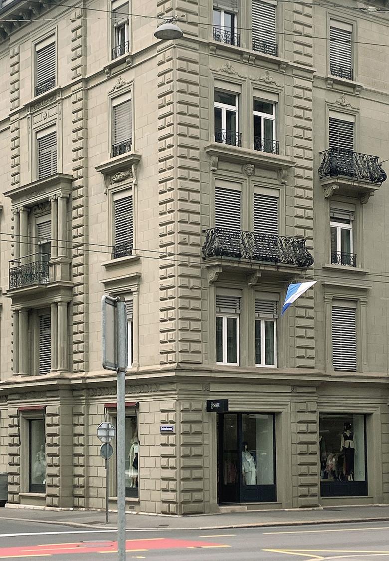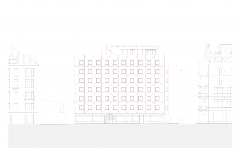 Das Wohn- und Geschäftshaus hat durch seinen modernistischen Ausdruck eine Eigenständigkeit, die in einem Kontrast zu den umliegenden historischen Bauten steht und dadurch eine eigenwillige Identität schafft. Die schlichte Lochfassade, geprägt von einem strengen Raster, wird bewusst beibehalten. Mit der reliefartigen Überformung der Fassade erfolgt eine Neuinterpretation der bossierten, historistischen Nachbarsfassaden und tritt trotz ehrlichem Beibehalten seiner modernistischen Züge in den Dialog mit diesen.