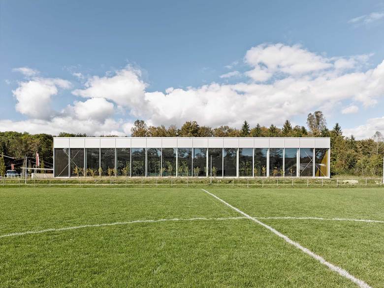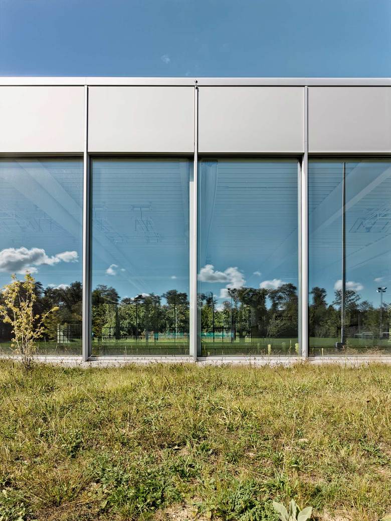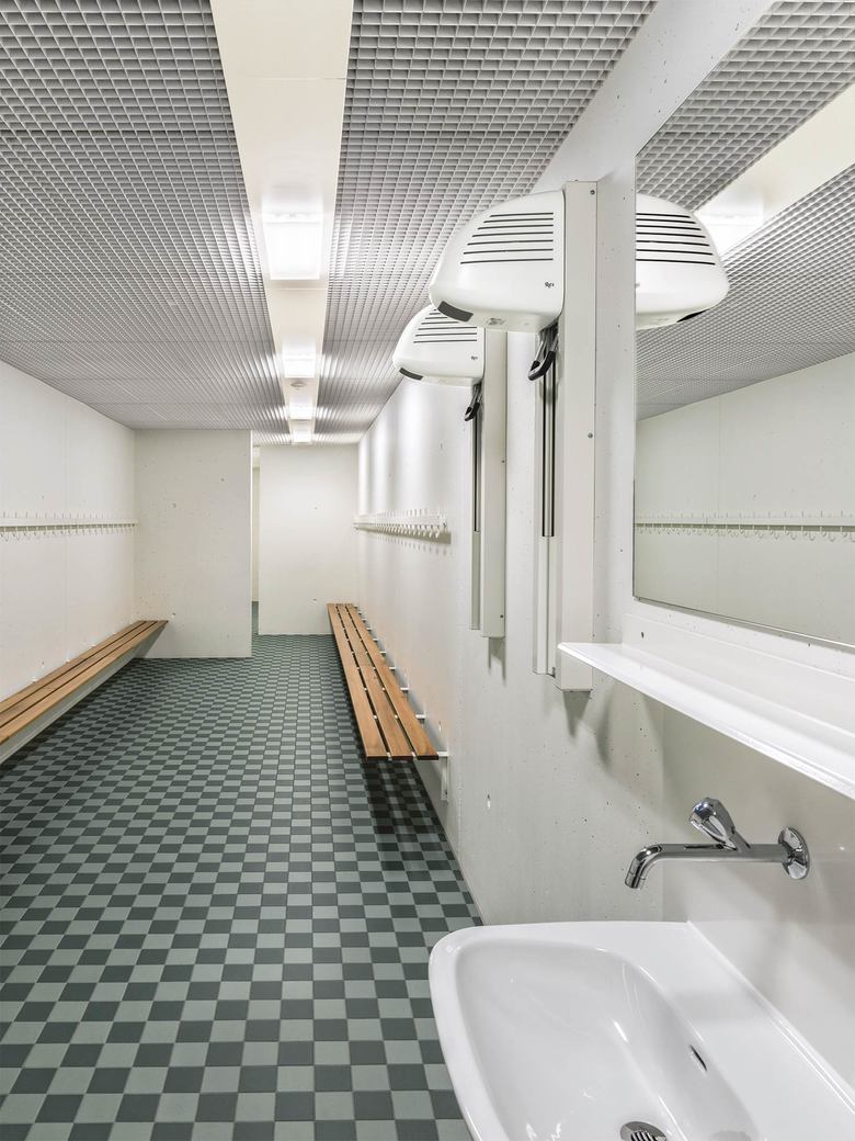 Im Gegensatz dazu sind die beiden Seitenfassaden mit einem groben, zweifarbigen Kellenwurfputz behandelt. Die erdigen Farben nehmen Bezug auf die Natur und fügen das Gebäude selbstverständlich in den Grünraum ein. Im Innenraum schaffen die mit Douglasienholz bekleideten Wandflächen und der helle Kunststeinboden eine warme Atmosphäre. Die weiss gehaltenen Betonflächen und Stahlstrukturen sowie der grüne Sportboden werden mit den Ausblicken in die parkartige Umgebung ergänzt.