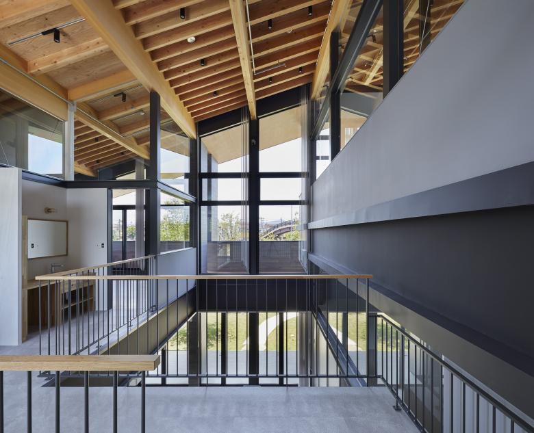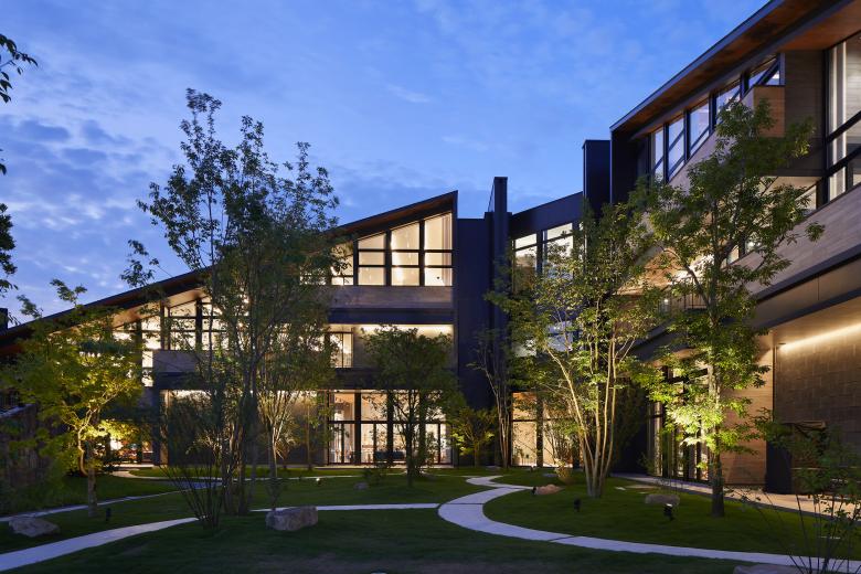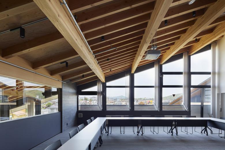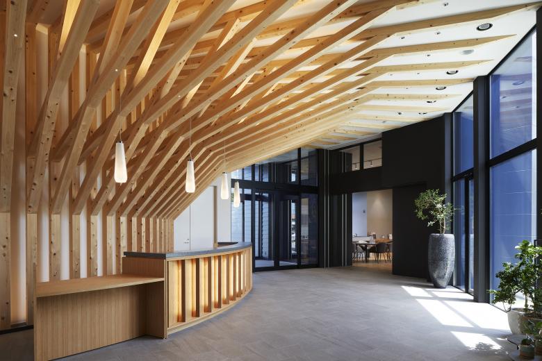 First of all, in order for a special building over 2,000 m2 to be made of wood and to have a part of the structure as an actual structure, it must be classified as "other buildings," which means that it must be divided into 1,000 m2 or less by a freestanding firewall (one-hour fireproof structure). To meet this requirement, we divided the L-shaped plan surrounding the green space into three buildings, with the central building as Building A, Building B on the west side, and Building C on the south side. Furthermore, the site is surrounded by a beautiful mountain range, so the roof slopes of Building B and Building C were determined to match the lines of the mountain range. The result is a large-scale building with elements of a residential building, a form suitable for a company building that deals with the living environment. The slope of this large double-shingle roof was set to take advantage of the extension of the maximum height limit to 16 meters in the promotion of wood use item that came into effect in 2019.