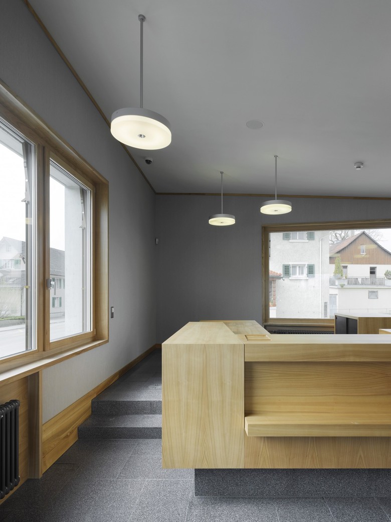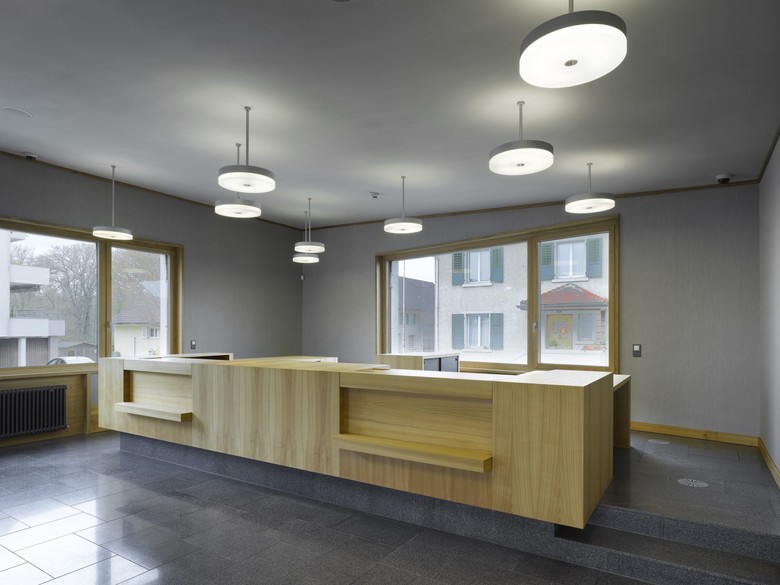 Der Anbau wurde als Massivbau in hellem Sichtbeton erstellt und innen gedämmt. Die farbliche Ähnlichkeit zum weiss verputzten Gemeindehaus lassen den eingeschossigen Anbau mit dem Hauptgebäude verschmelzen. Die unerwünschte Typologie eines Nebengebäudes oder Provisoriums wird somit vermieden. Dank der Verwendung von Beton können verschiedene Details wie Statik, Sockelausbildung und Witterungsschutz mit einem Materialgelöst werden. Analog dem äusseren Konzept wurde auch im Inneren der Übergang vom Anbau zum bestehenden Bau zum Thema gemacht. Eine Abfolge von Räumen (Windfang, Kundenhalle, Korridor, Kopierzone und Küche/Aufenthaltsraum) verbinden den Anbau mit dem bestehenden Gebäude. Die Materialisierung dieser Raumfigur hebt sich von den restlichen Räumen deutlich ab. Die Wände sind mit einer hellgrauen Leinentapete bespannt und werden durch einen Kirschbaumsockel gefasst. Alle Schreinerarbeiten und Fenster in dieser Zone sind aus Kirschbaum hergestellt. Zusammen mit einem grauen Kunststeinboden schafft diese Materialisierung eine angenehme Atmosphäre und verleiht der Bank eine eigene Identität. Der neue Dorfplatz liegt auf dem Niveau des Ensembles Bank, Gemeindehaus und Post und setzt sich vom Strassenniveau und den Kundenparkplätzen um einige Stufen ab. Die neuen Dimensionen des Platzes erlauben vielfältige Nutzungen wie Ausstellungen, Gemeindemarkt, Bazar, Feiern, etc.