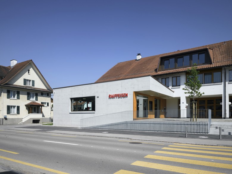 Die bestehende, über drei Geschosse organisierte Bank wurde gegen die Kantonsstrasse mit einem Anbau erweitert. Neu befindet sich die Bank nur noch im Erdgeschoss. Durch die neue Nähe zum Strassenraum stärkt die Bank ihre Präsenz im Dorf. Unterstützend wirken das aufsteigende Pultdach,die leicht ausgedrehte Westfassade sowie das Heranführen des Trottoirs bis zur Bankfassade. Ein markantes Vordach definiert den Eingangsbereich und steht im Dialog mit dem neuen Dorfplatz und der Arkade des Gemeindehauses. Unter diesem Vordach befinden sich der Eingang zur Bank, ein Bancomat und ein Bankbriefkasten.