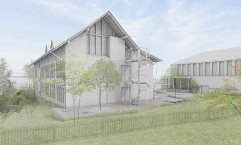 Die neue aussenliegende Fluchttreppe ist nicht nur Fluchtweg, sondern ein gliederndes Element im Aussenraum. Die optionale Fassadenbegrünung fördert die Biodiversität, mindert die Hitzeentwicklung und filtert die Sichtbeziehung vom Lernbereich zum Pausenplatz.