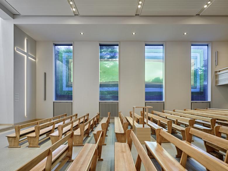 Der bestehende dichte Grüngürtel wurde zur Strasse hin gelichtet und fasst zwischen der hohen Hängebuche und dem aufgesetzten Pultdach den Vorplatz. Ein choreografisch inszenierter Pfad führt durch eine Raumfolge gedrückter und hochragender Räume, erst unter dem niedrigstehenden Vordach in das Foyer, bis endlich zum überhöhten zenital belichteten Altarraum.