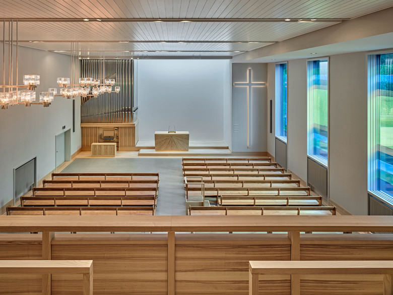 Das Raumprogramm der Kirche wurde mit einem Mehrzweckraum für hundert Gäste, einer Empore und einem abgetrennten Eltern-Kinder-Zimmer erweitert. Hierfür liess man den Kirchensaal bestehen und ersetzte das Konglomerat der Annexbauten durch einen eingeschossigen, klar strukturierten Holzbau. Der neue Anbau hat die Form zweier gegenläufig versetzter Pultdächer, an dessen Enden der grosse Mehrzwecksaal und die Unterrichtszimmer gesetzt sind. Zwischen den gross dimensionierten Mittelstützen fällt warm gefärbtes Tageslicht in das lang gestreckte Foyer. Die roh belassenen Holzbinder und silbrig lasierten Deckenelemente verleihen den Innenräumen einen säkularen Ausdruck und eine gedämpfte Akustik. Hingegen entwickelt im Kirchensaal das über die weisse Altarrückwand fallende Zenitallicht eine kontemplative sakrale Raumstimmung. Hier entfaltet sich für Chorgesang, Orgel und Rede eine üppigere Akustik mit längerem Nachhall. Empore und Eltern-Kinder-Zimmer mitsamt Orgel und Altar wurden in einer fein detaillierten Schreinerarbeit aus Braunkern-Eschenholz und Messing ausgeführt.