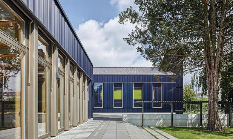 Eine dunkelblau eloxierte Fassadenhaut aus gekantetem Aluminiumblech umhüllt und verbindet Alt- und Neubau. Im wechselnden Licht spielt das tiefe Blau seinen Reichtum an Farbtönen aus und veredelt die einfach detaillierte Industriefassade in ein facettenreiches Gewand, das an den Faltenwurf der Madonna in mittelalterlichen Bildern erinnert.