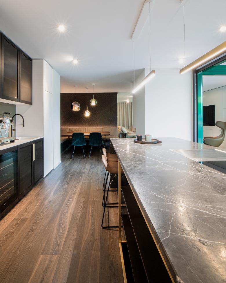Das von iam sanierte Apartment am Englischen Garten ist Teil eines Mehrfamilienhauses aus den 60er Jahren. Der Grundriss wurde den Anforderungen der Bauherren entsprechend aufgebrochen, um neue großzügige Wohnräume zu schaffen. Dunkles Parkett und eine warme Farbgestaltung kreieren atmosphärische Räume mit durchdachten Sichtbezügen zum begrünten Umfeld. Die Fassadengestaltung des Bestands, sowie die grüne Umgebung wird durch farblich korrespondierende Elemente in das Innenraumkonzept adaptiert. Dieses nimmt sich mit hellen Farben der Einbauten zurück und wird durch ausgewählte feine Mustertapeten und Messingdetails als Leitmotiv akzentuiert.