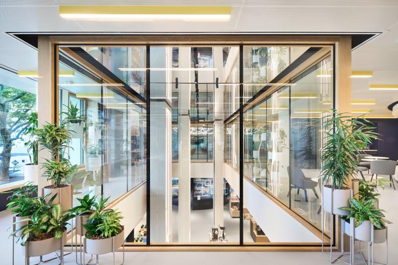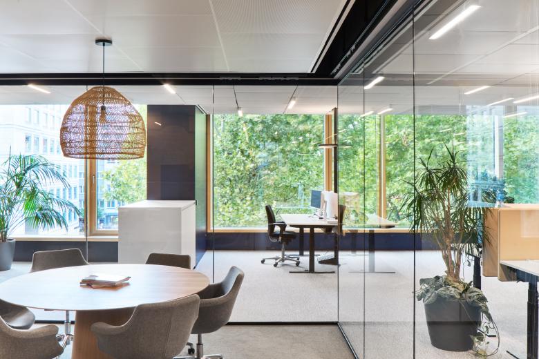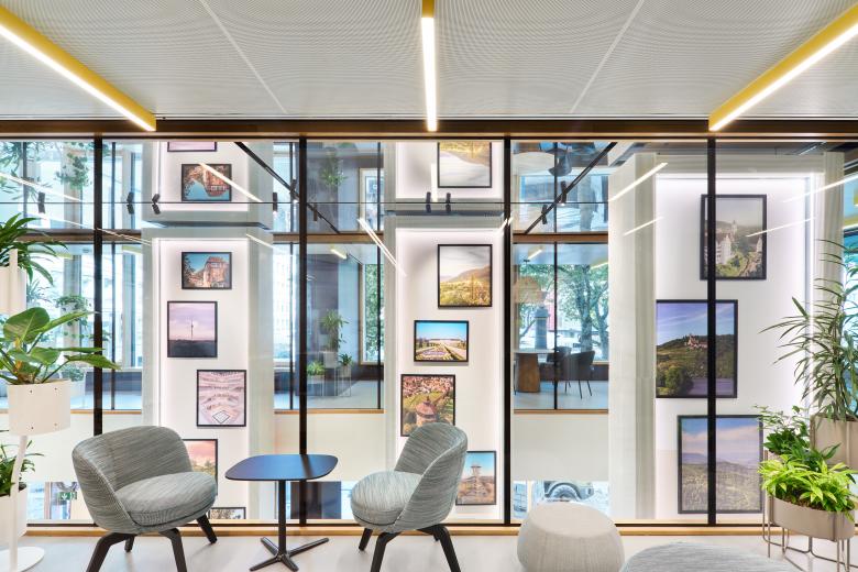 Vom i-Punkt aus blickt man durch die Verglasung des offenen Atriums in die Flächen der ersten Etage. Dort werden Besprechungs-, Workshop- und Veranstaltungsräume sichtbar. Diese sind Bestandteil der Arbeitswelten für Stuttgart Marketing, werden aber auch an externe Interessierte vermietet: Denn das Haus des Tourismus versteht sich als offenes Haus mit Angeboten für eine breite Nutzung. Die drei mietbaren Flächen sind unterschiedlich konfiguriert. Allen gemein ist der herrliche Ausblick auf das Treiben auf dem Marktplatz. Farb- und Materialwelt sind aus den Corporate-Farben der Stuttgart Marketing GmbH abgeleitet und bieten damit ein Identifikationsmoment für die Mitarbeitenden.