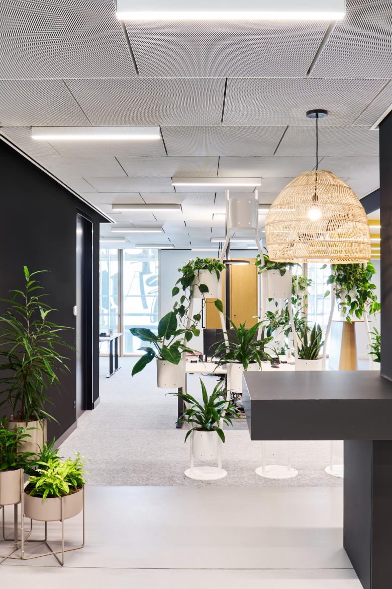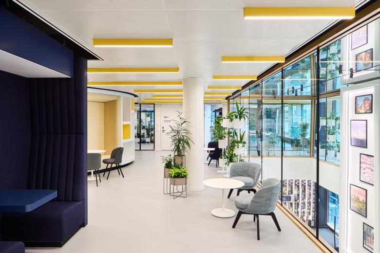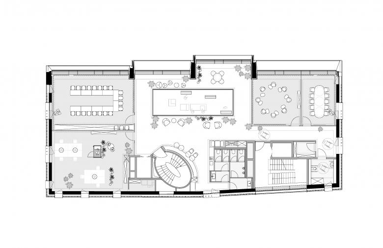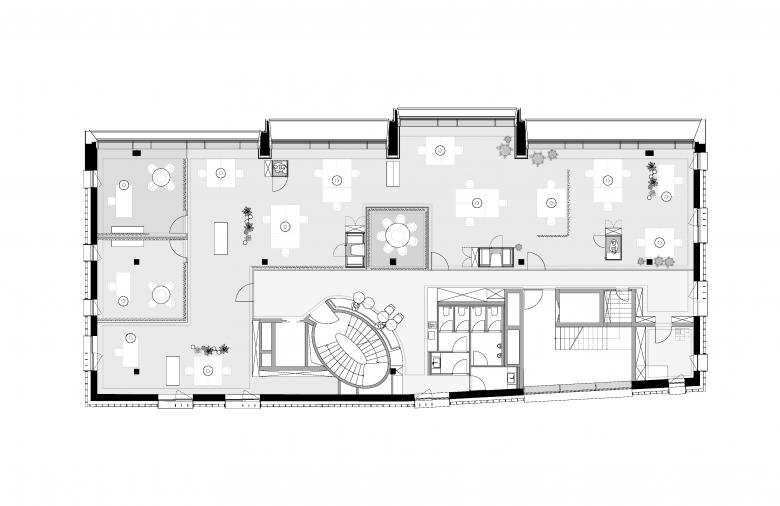 Die auf drei Geschosse verteilten Arbeitswelten der Stuttgart Marketing GmbH und des Tourismus Marketing GmbH Baden-Württemberg (TMBW) bieten ein breites Angebot für unterschiedliche Modi der Arbeit: von konzentriert und kreativ bis kollaborativ und kommunikativ. Um den ovalen Treppenhauskern, ein Relikt des Bestandsgebäudes, sind auf allen Etagen die Teeküchen und Pausenbereiche organisiert. In die ovale Rückwand sind jeweils ein Alkoven und ein setzkastenartiges Regal integriert. Im Regal werden verschiedene Objekte präsentiert, die einen eigenen Erzählstrang als verbindendes Element über die Etagen eröffnet.