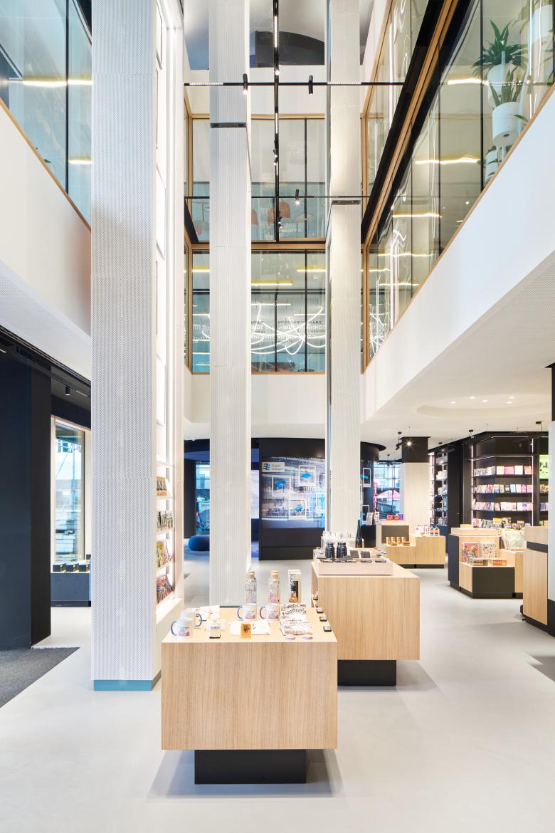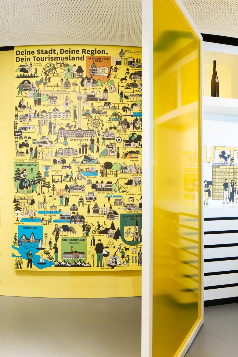 Die Touristinfo ist das Herzstück des Gebäudes und ein klarer Identitätsstifter. Die gesamte Präsentation der Produkte wie der Infomaterialien wird in eine einheitliche wie eindrückliche, nach außen hin ablesbare Form mit starkem Absenderverhalten und hohem Kaufimpuls nach innen übersetzt. Digitale und analoge Medienflächen werben für Stuttgart, die Region und das Urlaubsland Baden-Württemberg. Die Bereiche für Information, Verkauf und die Angebote der Markenpartner sind klar gegliedert. Durch die flexiblen Präsentationsmöbel lässt sich der Raum schnell verändern und weiterentwickeln.