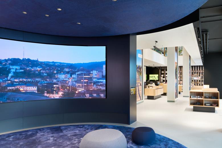 Auf dem Weg zum populären Kaufhaus Breuninger passieren zahlreiche Einkaufsbummler wie Flaneure das Haus des Tourismus. An dieser prominenten Gebäudeecke öffnet sich eine interaktive Bühne nach außen. Auf einer großformatigen LED-Wand werden Image-Filme in einem kinoartigen Präsentationsraum gezeigt – und das auch außerhalb der Öffnungszeiten. Der Ort eignet sich für digitale wie physische Inszenierungen gleichermaßen. Für die Bespielung mit hochwertigem Content sorgen u.a. die verschiedenen regionalen Markenpartner, die zudem einen regelmäßigen Wechsel im Programm garantieren. Hier bleibt man stehen, informiert sich und kommt gern zurück, um sich aufs Neue überraschen zu lassen.
