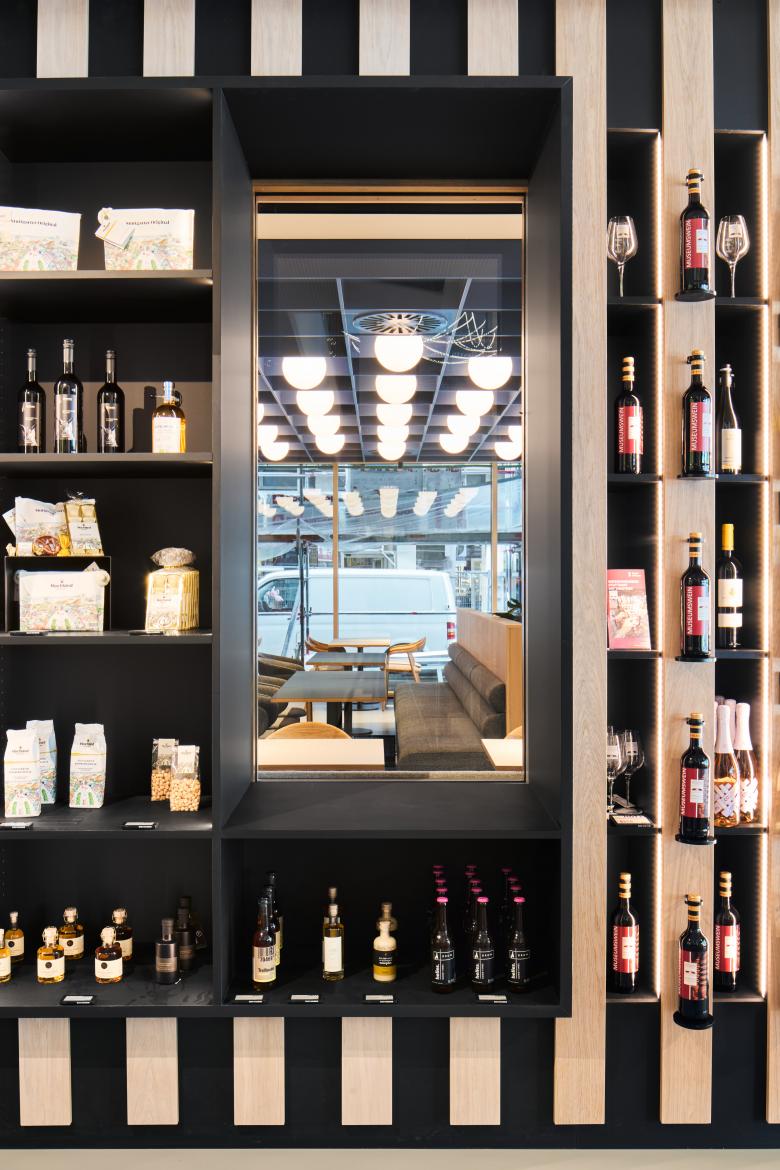 Regionale Produkte sind ein wichtiger Botschafter, von denen es im i-Punkt ein breites Angebot gibt. Hier gehen nicht nur die Gäste der Stadt gern auf Entdeckungsreise nach Erinnerungen zum Mitnehmen, sondern auch Einheimische finden schnell ein passendes Geschenk und Stuttgart-Mitbringsel. Handwerk, Kulinarik und Souvenirs werden auf den verschiedenen Tresen präsentiert. Ein großes Weinregal zeigt die Vielfalt regionaler Winzer und etabliert Stuttgart und die Region als Ziel für Genussreisende. Ein integriertes Fenster ins benachbarte Restaurant animiert dazu, sich davon gleich in der Praxis zu überzeugen.
