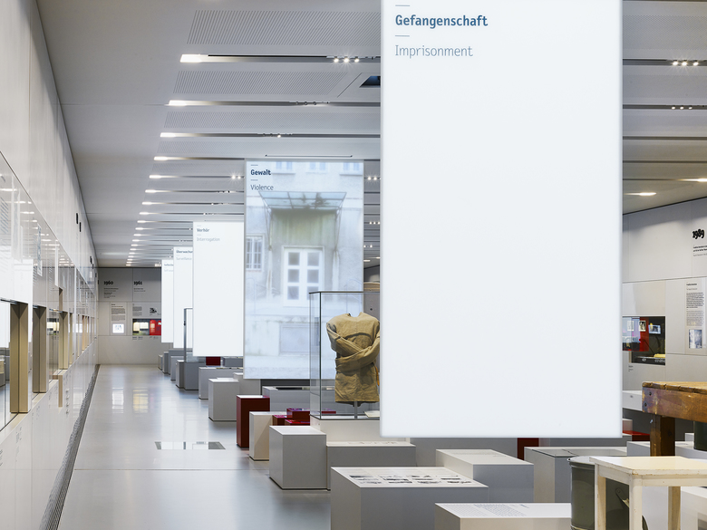 Bei der Dauerausstellung im einstigen zentralen Untersuchungsgefängnis der DDR-Staatssicherheit in Berlin-Hohenschönhausen stehen die Biografien und persönlichen Erfahrungen der Opfer im Mittelpunkt.Die Gestaltung der Gedenkstätte unterscheidet deutlich zwischen dem authentischen Ort als »Geschichtsträger« und der Dokumentations- und Ausstellungsebene. Die medialen Informationsschichten heben sich von der historischen Bausubstanz ab und differenzieren zwischen dem Authentischen und dem Neuen.