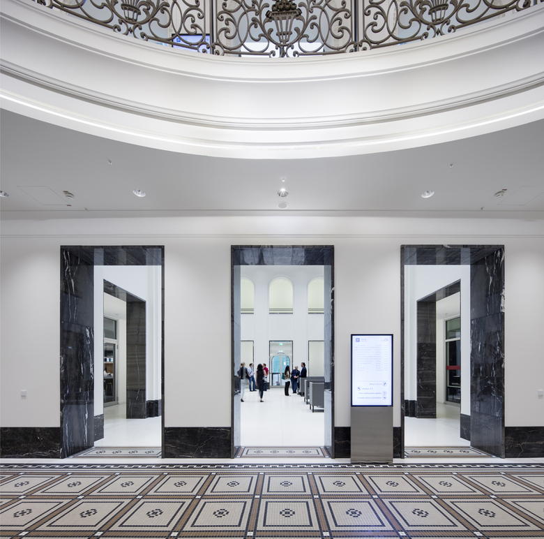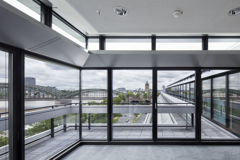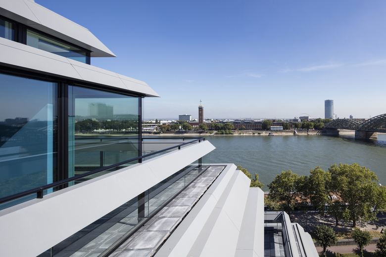 Die ehemalige Bahndirektion liegt am Konrad-Adenauer-Ufer vis-à-vis zum Rhein und in unmittelbarer Nähe zum Kölner Hauptbahnhof. Der Entwurf berücksichtigt den denkmalgeschützten Bestand sowie das historische Fassadenbild und entwickelt eine zeitgemäße Lösung für das im zweiten Weltkrieg zerstörte Mansarddach. Metallene Bänder umhüllen die insgesamt vier Dachgeschosse und zeichnen mit ihrer Neigung die historische Dachkontur nach, die lange Zeit die Rhein-Silhouette der Domstadt prägte. Die hinter den Bändern liegende Glasfassade folgt nicht der ursprünglichen Dachschräge, sondern steht orthogonal zu den Geschossplatten. Im umlaufenden Fassadenzwischenraum entstehen Dachterrassen mit atmosphärischem Mehrwert und einem Panoramablick auf die Stadt. Die denkmalgeschützte Fassade der unteren vier Geschosse wird aufgearbeitet und umfassend saniert; die imposante, historische Eingangshalle wird originalgetreu in den Neubau integriert. Drei erdgeschossige Hauptzugänge am Konrad-Adenauer-Ufer ermöglichen eine Aufteilung in verschiedene Mietbereiche. Diese erfüllen alle Anforderungen an moderne, flexible Büroflächen, die vom Zellenbüro bis zum Businessclub alle gängigen Arbeitsplatzkonzepte abdecken können.