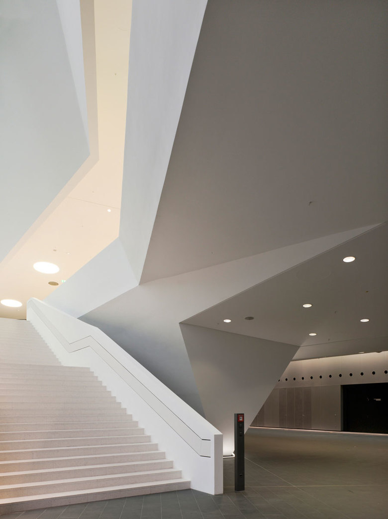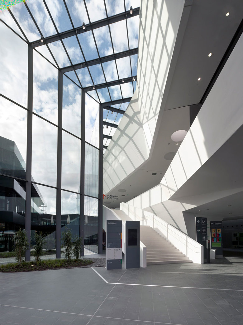 Der bestehende Eingang Mitte der NürnbergMesse wird seiner Rolle als Haupteingang nicht gerecht: Von außen schwer ablesbar, führt der niedrige Eingangsraum in eine unübersichtliche Gebäudestruktur. Das neue von weitem sichtbare Lamellendach schafft es, die verschiedenen Außen-und Innenräume zu vereinigen. Es überspannt den Eingangsbereich, verbindet diesen mit U-Bahnstation, Taxivorfahrt und Bushaltestelle und markiert damit zeichenhaft den Haupteingang der NürnbergMesse. Die unter dem Lamellendach entstehende Loggia empfängt alle Besucher und leitet sie wettergeschützt in die lichtdurchflutete zentrale Eingangshalle, von der aus die unterschiedlichen Messehallen, Kongressbereiche und der Messepark erschlossen werden. Der neue multifunktionale Konferenzsaal liegt als scheinbar schwebender Baukörper innerhalb der Halle. Die großzügige Empfangstreppe und das vorgelagerte Foyer bieten den Kongressbesuchern einen Logenblick auf das rege Treiben in der Loggia und binden komfortabel an den bestehenden Kongressbereich an.