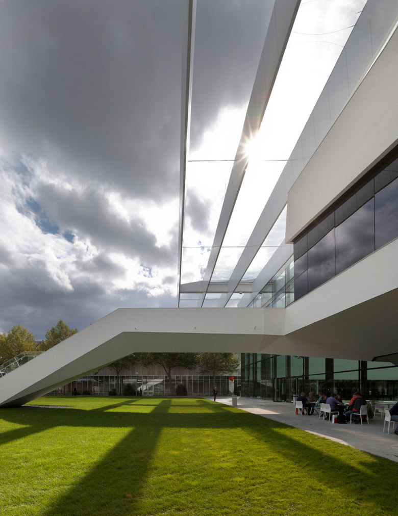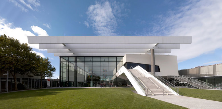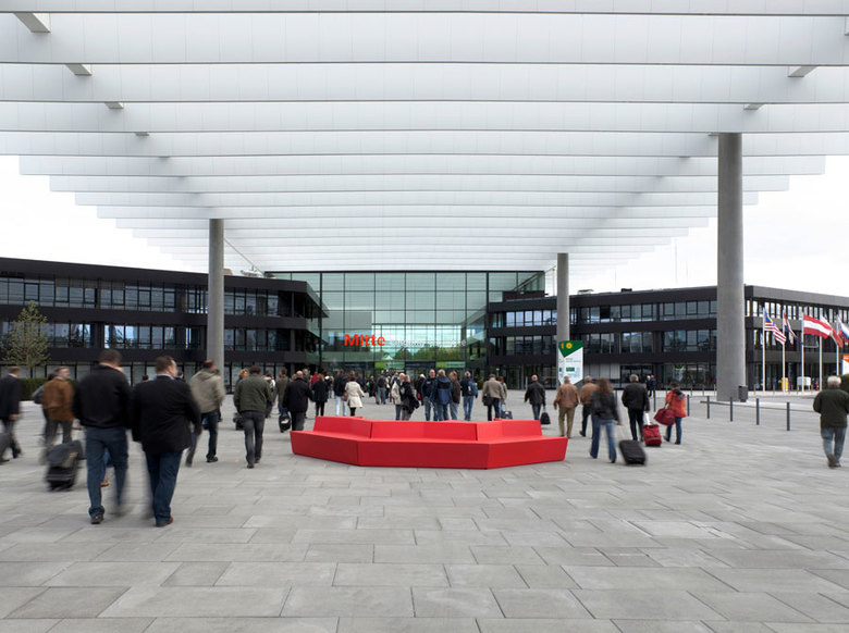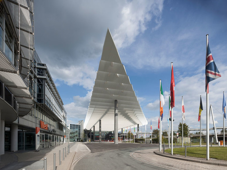 ADDED VALUE: Der Bau eines weiteren Konferenzraumes und die Vergrößerung des Eingangsfoyers würden zwar die Kapazitätsengpässe der Messe beheben, wären aber nur ein weiterer additiver Baustein der seit den 60er Jahren mehrfach ergänzten Messe. Der Entwurf schafft mit dem 250m langen Lamellendach zusätzlich ein Superzeichen, das mehrere Funktionen gleichzeitig erfüllt: Es ordnet die verschiedenen Bauteile der Messe, gibt ihr eine eindeutige Adresse, verbindet Innen- und Außenräume und definiert ein „urbanes Foyer“, das sich von der Zufahrt über den Vorplatz, den Eingang, das Hauptfoyer bis in den neuen Messepark erstreckt.