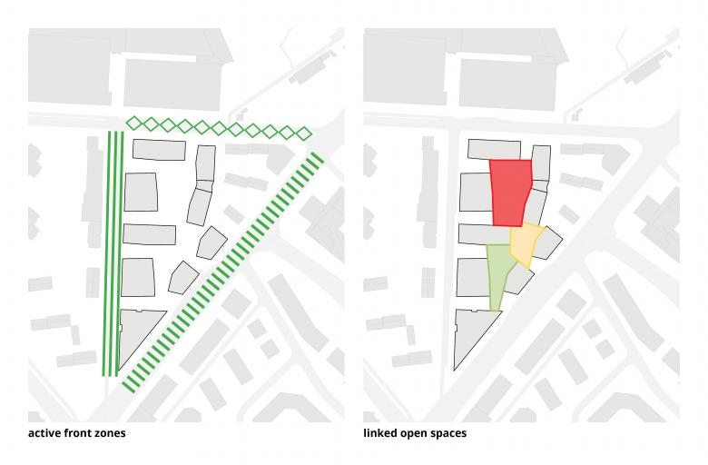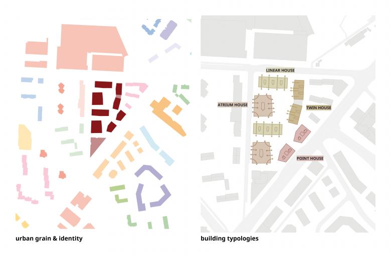 The concept responds to the heterogeneous context with a very clear standpoint of its own. Instead of grand gestures and high points, the district offers a contrast with compact, low-rise buildings. The high density creates its own world inside, creating several cosy, small-scale niches. A backbone of interlocking public spaces creates a liveable, sheltered environment. The new neighbourhood is characterised by four different typologies: the atrium dwelling, the linear dwelling, the point dwelling and the twin dwelling. The selection of the number of buildings and typologies ensured both cohesion and optimisation, creating a measured balance between repetition and variation.