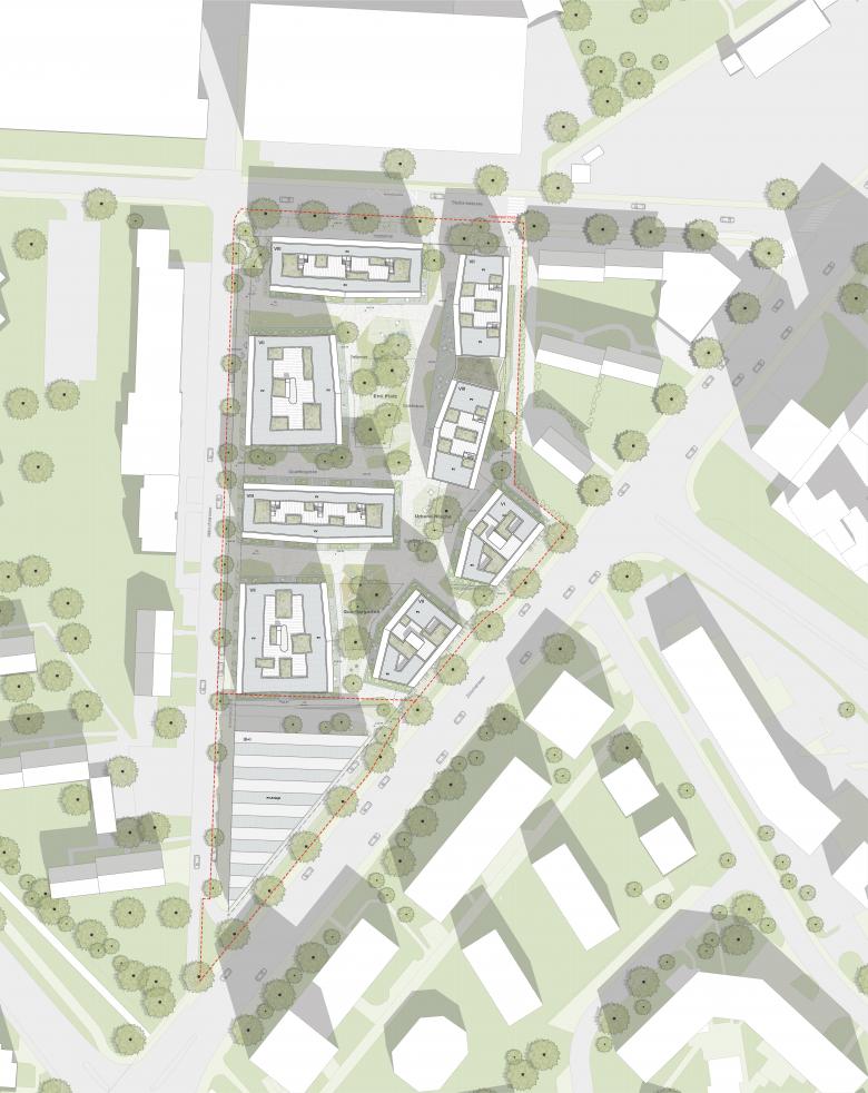 This inner-city area is being transformed into a high-density neighbourhood with housing, offices, shops and gastronomy. The plot is surrounded by small-scale housing, compact tower blocks and various industries - including a high-rise warehouse for Coca-Cola. As the company expands its operations, this increases the differences in scale. In addition, the site is heavily affected by noise pollution, as it is close to a motorway exit, along a busy thoroughfare and directly under the approach route of Zurich airport. Such a challenging location required a precise design solution.