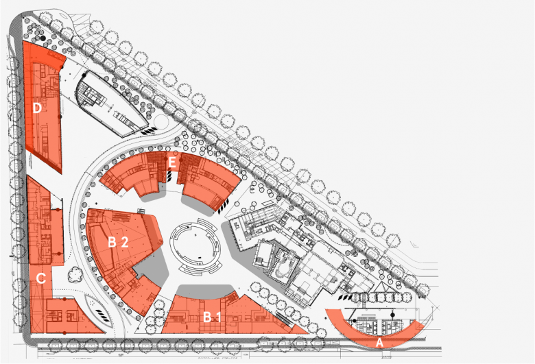 einzelnen Gebäudeteile sowie die Erdgeschosszonen, einschließlich der Lobbys,