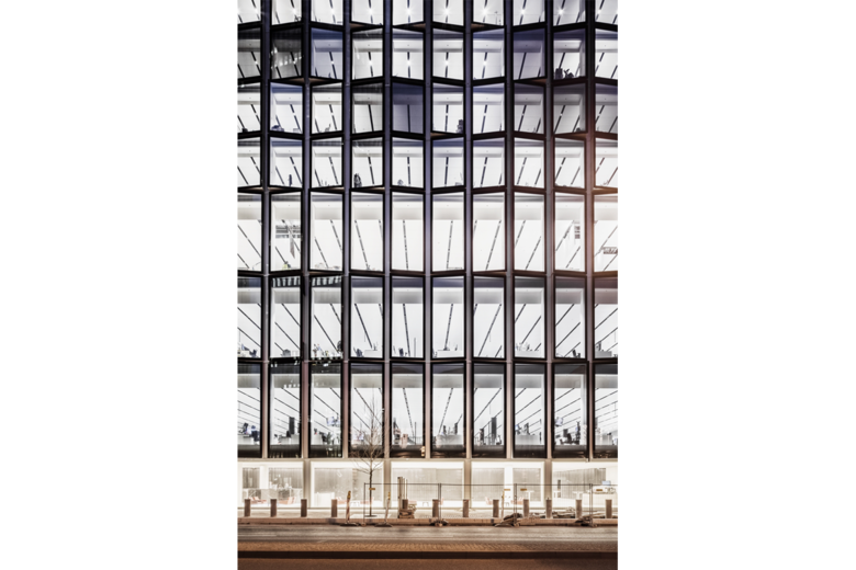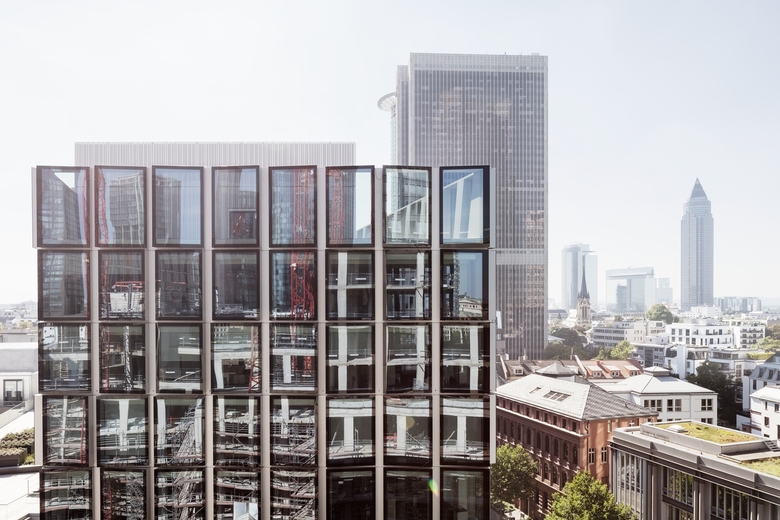 Beim Neubau für den Deutsche Bank Campus in Frankfurt am Main ist es gelungen, ein transparentes Gebäude zu realisieren, das sich in seine innerstädtische Nachbarschaft einfügt. Um ausreichend Platz für die rund 2.000 Arbeitsplätze zu schaffen, wurde das angrenzende Bestandsgebäude (das von KSP Jürgen Engel Architekten bereits 2003 errichtet wurde) in die Planung einbezogen und beide Bauten miteinander verbunden. Die kristalline Fassadenstruktur des Bestandsgebäudes (Naturstein) wurde beim Neubau auf eine Glasfassade übertragen. Von dieser kristallinen Fassade der Obergeschosse setzt sich die des Erdgeschosses mit ihren plan eingesetzten, großformatigen Fensterscheiben ab. Die Elementfassade hält die Glasscheiben in unterschiedlichen Winkeln, sodass vielfältige, interessante Reflexionen und Spiegelungen entstehen. In Ergänzung zu den offenen, transparenten Arbeitsplätzen wurde im Erdgeschoss eine „Servicezone“ mit Café, Restaurant und einem Lounge-Bereich eingerichtet. Das nachhaltige Gebäude erfüllt den LEED® Platinum-Standard.