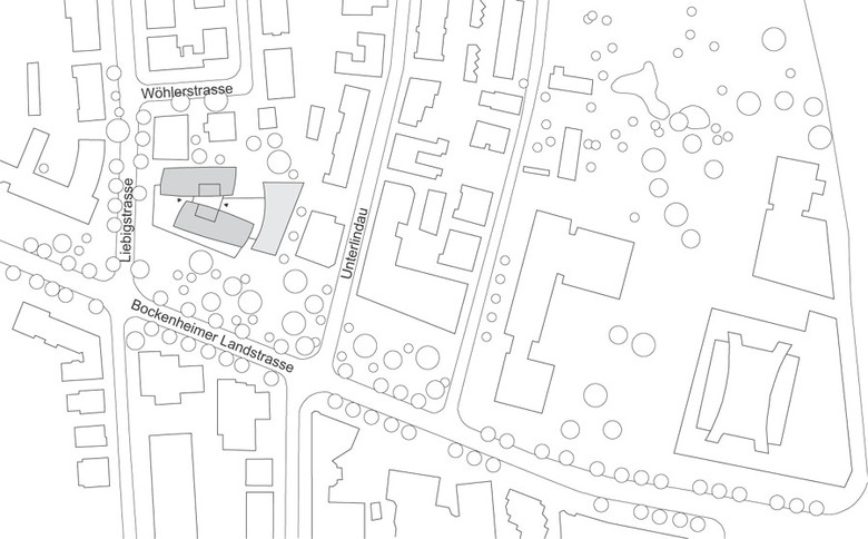 Die beiden schlanken Türme richten sich an den, an der Bockenheimer Landstraße aufeinander treffenden Stadtraster des Frankfurter Westends auf. Die gespannten Fassaden erzeugen eine dynamische Wirkung entlang der Gebäudelängsachse. Die aufrecht stehenden Fassadenelemente fassen zwei Stockwerke zu einer Einheit und lassen die Türme schlank und elegant wirken.