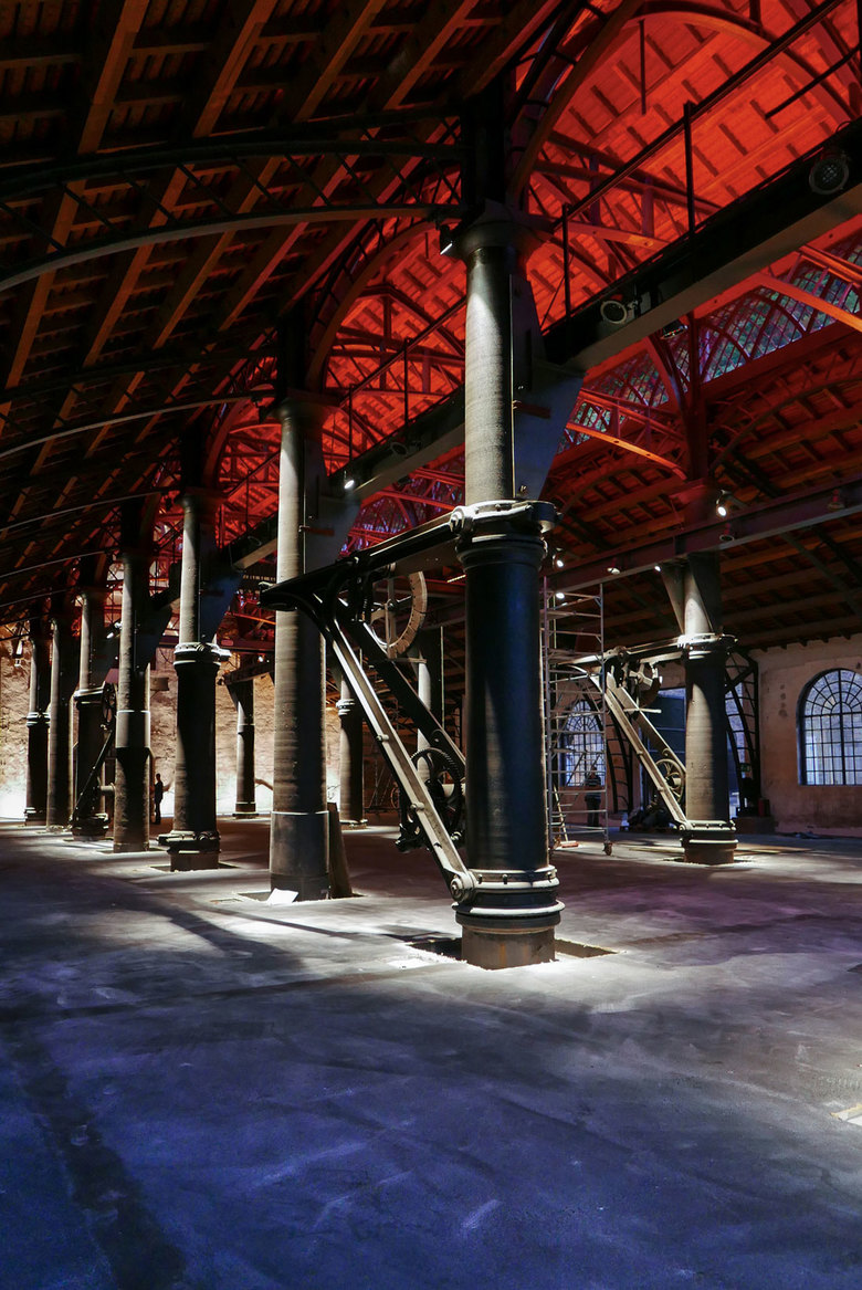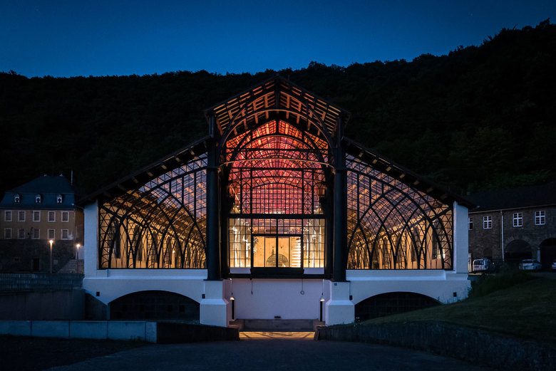 Um dem flexiblen Nutzungskonzept gerecht zu werden, hat Licht Kunst Licht eine Beleuchtung ausschließlich mit Led-Leuchten umgesetzt, die jedes Architekturelement einzeln betont und voll steuerbar ist. So werden differenzierte Lichtstimmungen angepasst an die momentane Nutzung erzeugt, die das nächtliche Gebäude nuanciert beleuchten. Der Blick von Aussen auf die gläserne Westfassade der Sayner Hütte führt in die Tiefe des Gebäudes, entlang des Weges der Eisenschmelze, bis hin zur Rückwand, die einst die Schmelzöfen enthielt. Die Beleuchtung unterstreicht die Leichtigkeit und Transparenz der basilikalen Bauform, lässt sie aus von innen heraus strahlen und kontrastiert sie so in der nächtlichen Ansicht gegen den Berg, aus dem das Eisen einst gewonnen wurde.