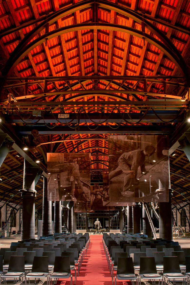 Im Inneren akzentuiert das Lichtkonzept die Architekturelemente einzeln und schafft so die Möglichkeit differenzierter Lichtkompositionen, ganz nach den Erfordernissen der jeweiligen Veranstaltung. Die Leuchten sind entlang einer horizontalen Ebene montiert, die die Längsausdehnung und Geometrie des Raumes betont, sowie sich dem formalen Kontrast zwischen den vertikalen Stützen des unteren Halbraumes und dem horizontalen Dachraum unterordnet. Im Zusammenspiel mit der Allgemeinbeleuchtung wirkt das Licht so gleichmäßig; die Gesamtatmosphäre öffnet sich dem Besucher, während das metaphorisch rote Dach eine formale Klammer bildet, die selbstverständlich auch in anderen Farben eingestellt werden kann.