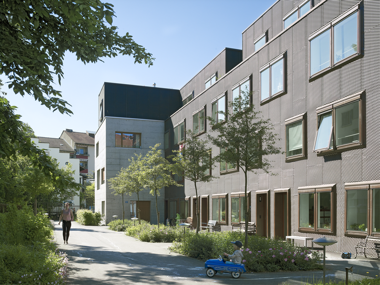 Die spezielle Stimmung eines Hinterhofes prägt den Entwurf auf allen Ebenen. Das Gebäude besteht aus zwei Trakten in Sichtbeton und Kupfer, wobei im Attikageschoss der kupferne Teil auf den Sichtbetontrakt übergreift und vice versa. Während die Maisonetten im kupfernen Teil direkt von aussen erschlossen sind, erfolgt der Zugang zu den Etagenwohnungen äusserst effizient über ein gemeinsames Treppenhaus. Die Wohnungen zeichnen sich durch eingezogene Loggien aus, sind ein- bis dreiseitig orientiert, teils langestreckt mit einem Korridor als Rückgrat oder eher kompakt mit zentralem Wohn- und Essbereich.
