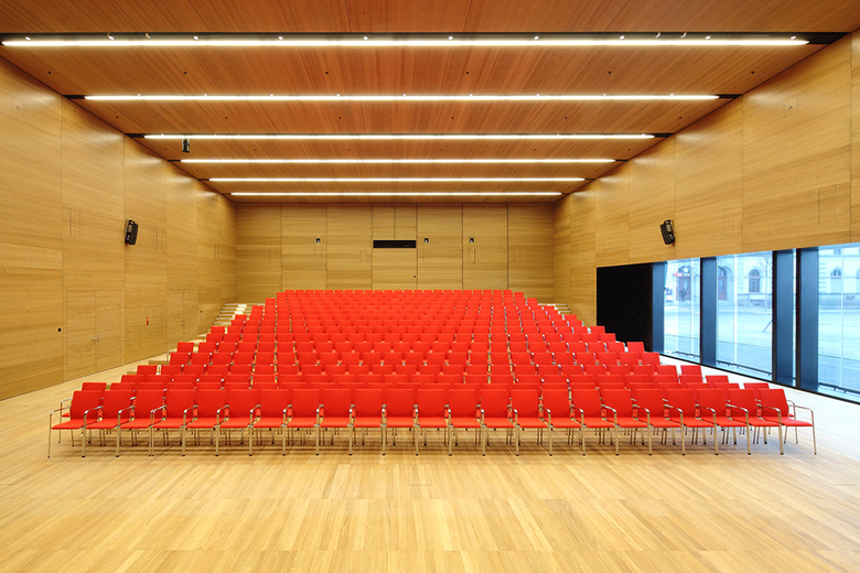 Der rund 170 m lange und 35 bis 55 m breite Gebäudekomplex gliedert sich im Wesentlichen in fünf Teile: den dreigeschossigen Kongresstrakt, den zweigeschossigen Foyertrakt, den sechsgeschossigen Verwaltungstrakt, den zweigeschossigen Museumstrakt sowie zwei sich über die gesamte Der rund 170 m lange und 35 bis 55 m breite Gebäudekomplex gliedert sich im Wesentlichen in fünf Teile: den dreigeschossigen Kongresstrakt, den zweigeschossigen Foyertrakt, den sechsgeschossigen Verwaltungstrakt, den zweigeschossigen Museumstrakt sowie zwei sich über die gesamte Grundrissfläche erstreckende Untergeschosse mit dem Seewasserkeller als unterirdischer Annex.