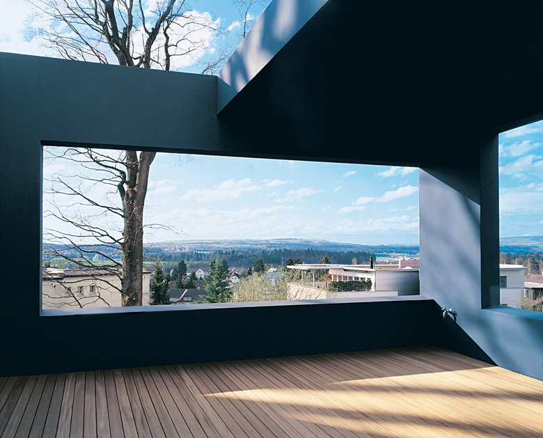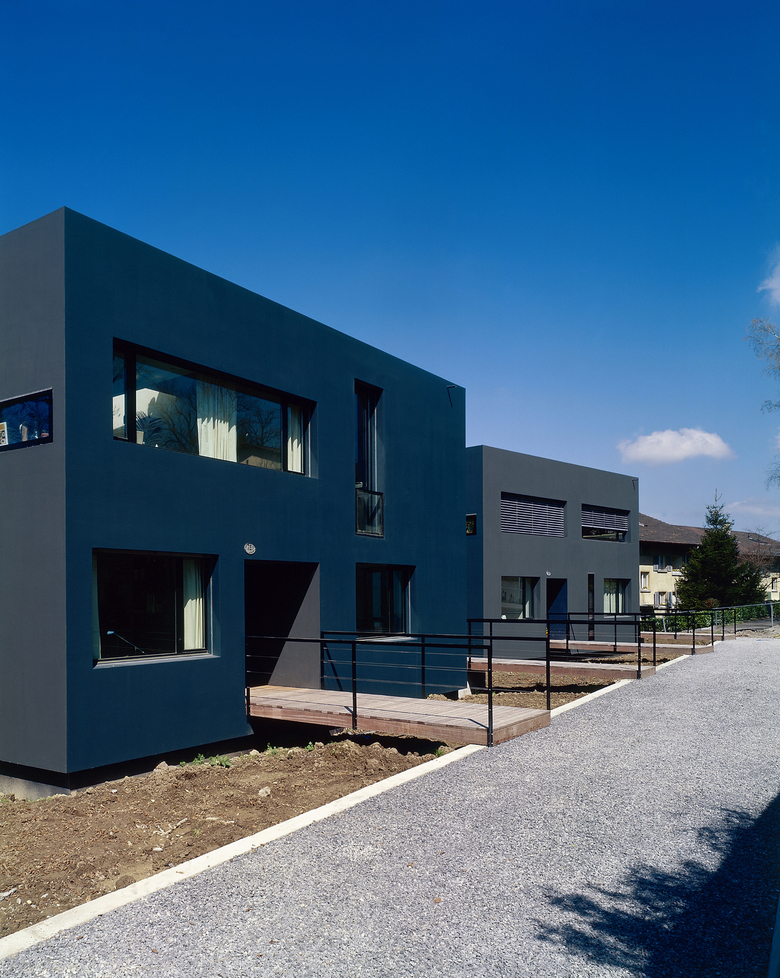 Der Zuschnitt des Grundstücks sowie die zweckorientierte Optimierung der Wohn-Nutzflächen führte zu zwei trapezförmigen Baukörpern. Die Volumen wurden parallel versetzt, sodass sie im Osten einen Zugangshof, im Nordwesten einen Gartenhof definieren. Durch die Kombination von dunkelgrün und dunkelblau gehaltenen Fassaden sind diese Aussenräume farblich spezifiziert. Die Brückenelemente der Eingänge überzeichnen die topografischen Verhältnisse und erhöhen die Privatheit der Einheiten. Auch die ausgeschnittenen hofartigen Öffnungen im Dachbereich gewähren als geschützte Loggien trotz hoher Dichte Privatheit. Die Variation der Grundrisse hatte Einfluss auf die Anordnung und Grösse bestimmter Fenster, und damit auf die Fassadengestaltung. Formal bezeichnend sind reduzierte Details für Dachränder und Fensterbänke. Unterschiedlich tief eingesetzte Fensterflächen entsprechen der räumlichen Situation im Innern sowie der Notwendigkeit, je nach Fall, von Storen-Stürzen. Diese charakterisieren den Ausdruck der Gebäude und relativieren die Kargheit der äusseren Erscheinung.