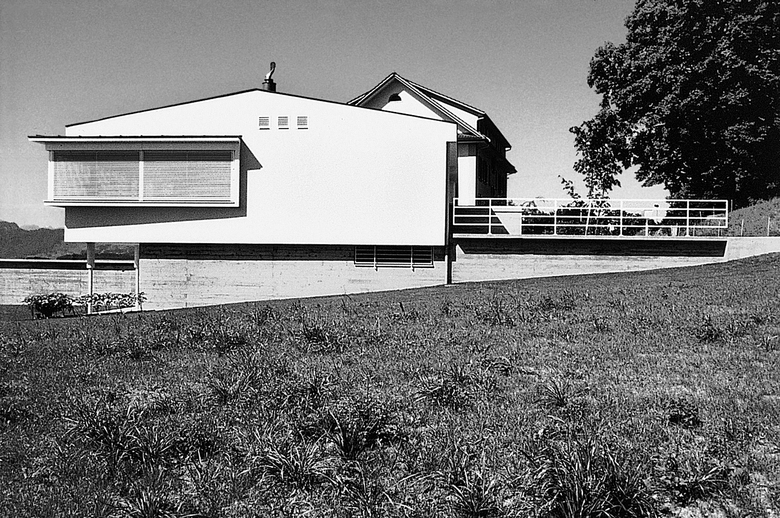 Die Aufgabe bestand darin, ein Einfamilien-haus zu projektieren, welches auf 170 Quadratmetern Bruttogeschossfläche mindestens fünf Räume beherbergen konnte. Die prominent gelegene, teure Parzelle mit Südlage und Alpensicht, deren Ausnützungs-ziffer sehr niedrig ist, befindet sich in einem Einfamilienhausquartier mit rigorosem Gestaltungsplan. Der Neubau zeigt sich als Fragment eines traditionellen Giebelhauses, welches mit Mitteln der modernen Architektur konstruiert wird. Die moderne Umsetzung erlaubte es, räumliche Beziehungen zwischen innen und aussen so zu intensivieren, dass trotz der stark beschränkten Wohnfläche eine grosszügig wirkende Anlage entstehen konnte. Die Materialisierung im Innenbereich des Wohngeschosses ist geprägt von einem an Ort geschliffenen florentinischen Travertin, welcher sich bis in den Aussenbereich der Terrasse und des Vorplatzes als Bodenschicht hinzieht. Brüstungsabdeckungen und Gesimse sind aus poliertem belgischem Granit. Die Wände wirken hautartig glatt, der Weissputz wurde mit einer Seidenglanzfarbe weisslich gespritzt.
