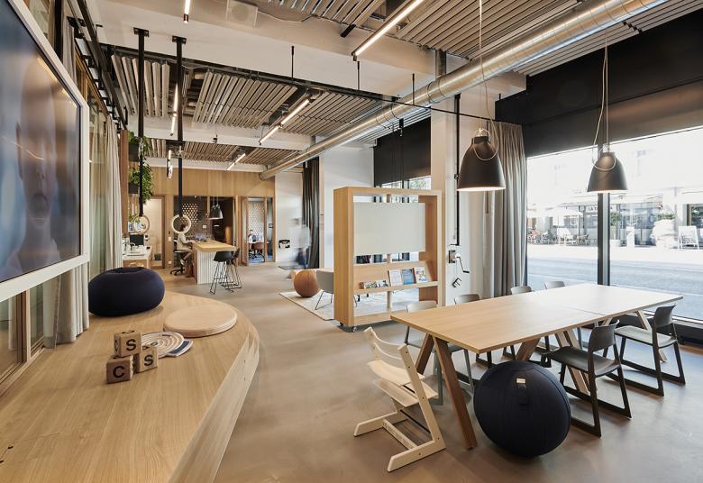 Im Design widerspiegeln sich die Werte und die Themen Gesundheit und Prävention und machen sie erlebbar. Bereits von aussen erhalten die Kundinnen und Kunden dank der grosszügigen Öffnung der Schaufenster Einblicke ins Innere und verschaffen der Marke Visibilität. Der Haupteingang führt zur grosszügigen Health Bar, an der frische Säfte serviert werden. An den Empfang schliesst sich die Fitness Lounge mit Pauschenpferd und Ringen an. Hier werden die Kundinnen und Kunden zu Gesundheits- und Präventionsthemen beraten und erhalten dank integrierter Technik interaktiv die Möglichkeit, ihre Gesundheit zu testen.