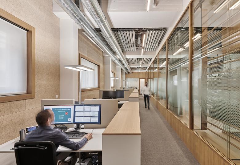 Die öffentliche Kundenzone wirkt durch die helle Einrichtung einladend und der hohe Anteil an Massivholz schafft eine warme und natürliche Atmosphäre. Diese wird durch die Raumhöhe und industrielle Decken- und Bodengestaltung kontrastiert. In den geschlossenen Beratungsräumen setzen die Architekten dagegen auf einen hohen Textilanteil. Hochflorige Teppiche dämpfen hier vertrauliche Besprechungen.