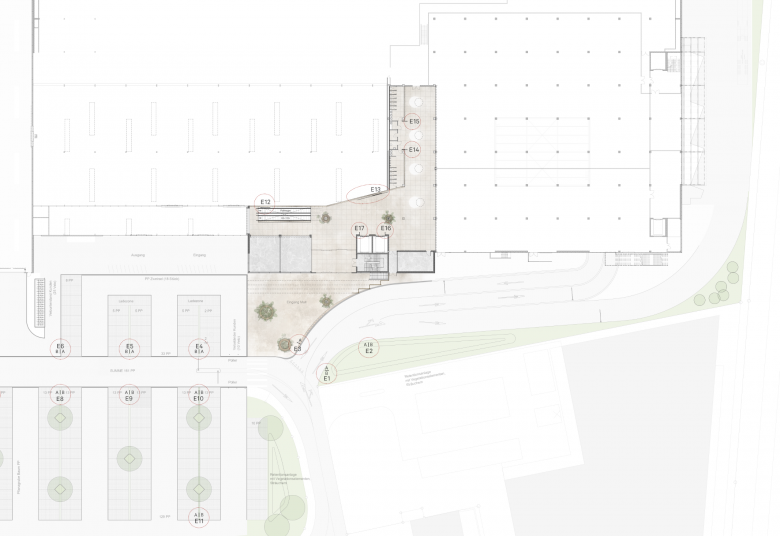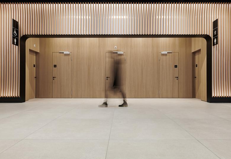 Für die Wandabwicklungen in der Mall hat sich das Design-Team für semi-transparente Polycarbonat Platten als authentisches Baumaterial entschieden. Diese lehnen sich in der Optik dem Bauhaus-Markt an. Darauf sind vertikal verlaufende Holzlamellen aufgesetzt, die sich in Richtung Nasszellen verdichten, wodurch eine Dynamik und ein Verlauf kreiert wird. Der helle Bodenbelag aus grossformatigen Keramikplatten (120x120cm) der die Grosszügigkeit der Nutzungsflächen aufnimmt, kontrastiert mit den in Schwarz gehaltenen Abdeckungen, Center-Beschriftungen und Sitzgelegenheit . Die Mall wird zum Spiegelbild der Kompetenz als Fachmarkt.