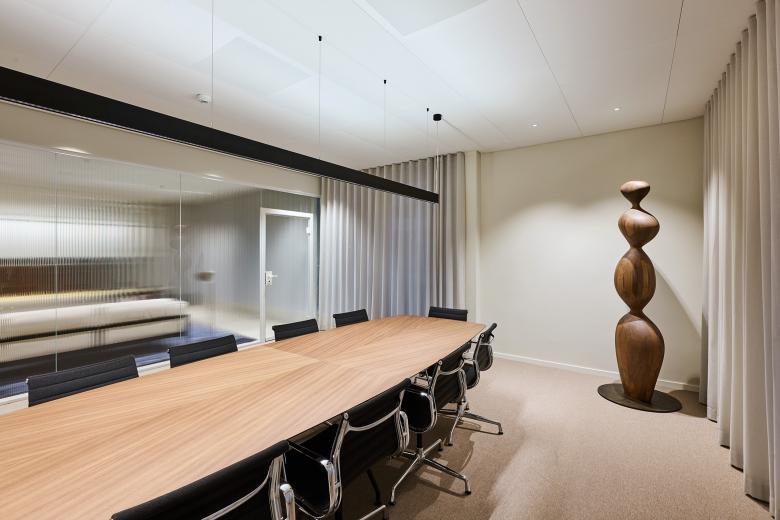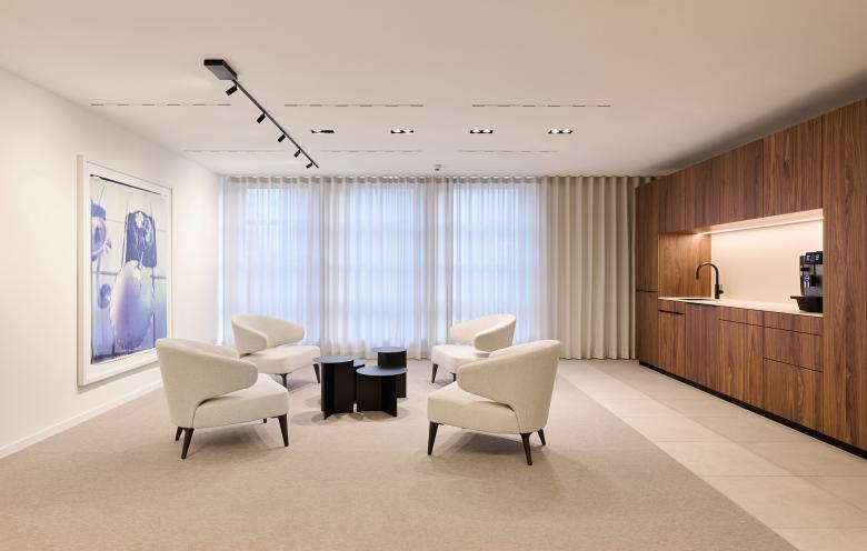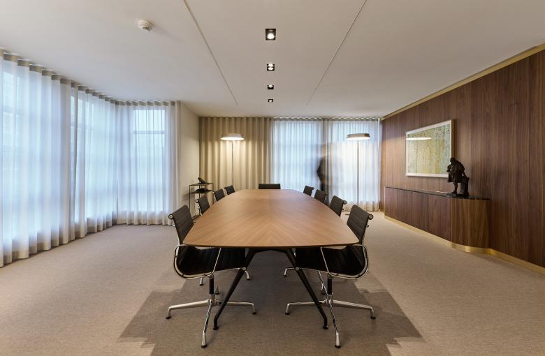 Gegenüber dem Eingang befinden sich entlang der ebenerdigen Fensterfront die Empfangslounge mit Einbauküche und ein angrenzendes Sitzungszimmer. Dieses wird durch eine wellenförmige, blickdichte Glaswand von der Lounge getrennt. Sowohl Lounge als auch Meetingraum sind mit Teppichen und warmen Materialien gestaltet. Die Technik des Raumes ist unauffällig hinter einer geschlossenen Metalldecke verborgen. Diese besteht aus grossflächigen Platten, die sich für Revisionen leicht öffnen lassen. Dank minimaler Fugen und einer rauen Oberflächenbeschichtung wirkt die Decke trotzdem beinahe wie eine klassische Gipsdecke.