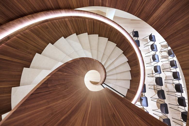 Die hochwertige und zugleich zurückhaltende Designsprache von Mint Architecture übersetzt die Corporate Identity der Privatbank und spiegelt ihren Anspruch an Nachhaltigkeit wider. Statt bestehende Strukturen abzubrechen, wurden nutzbare Elemente wiederverwendet, ergänzt und aufgearbeitet. Geradlinige Formen und die durch das fehlende Tageslicht dunkle Atmosphäre im Untergeschoss wurden durch die Öffnung der beiden Geschosse sowie durch subtile Rundungen aufgebrochen. Für spannende Kontraste sorgt die Materialisierung mit dunklem Nussbaumholz und hellen Farben. Dieses Konzept widerspiegelt sich eindrücklich bei der mit Nussbaum verkleideten Wendeltreppe, welche die beiden Stockwerke miteinander verbindet. Ihre geschwungene Form bricht die Dominanz des Holzes und verleiht der Treppe eine skulpturartige Anmutung. Gleichzeitig schafft sie eine visuelle und akustische Verbindung zwischen Erd- und Untergeschoss und erzeugt so eine harmonische, lebendige Atmosphäre. Zusätzlich betonen Deckenelemente, Säulen und Möbel mit runden Formen die ausgewogene Komposition aus geraden und geschwungenen Linien sowie aus hellen und dunkel akzentuierten Farbtönen.