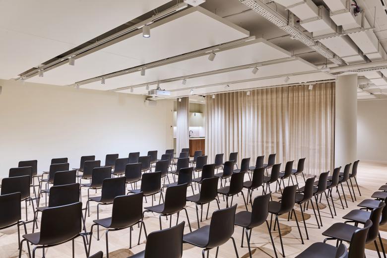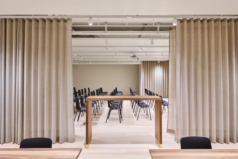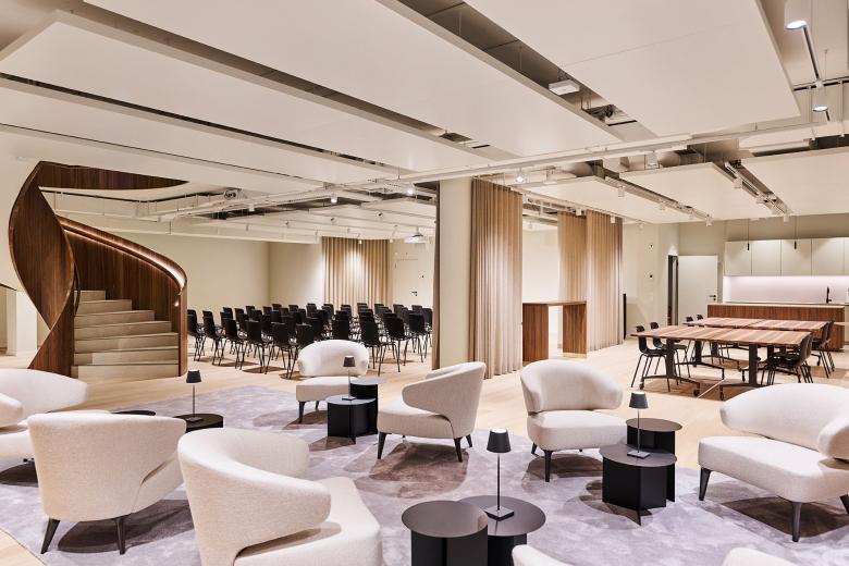 Die Innenarchitektur mit ihrer weichen und abgerundeten Formensprache greift die Raumstruktur der beiden Geschosse harmonisch auf und erzeugt spannungsreiche Kontraste. Im multifunktionalen Untergeschoss fügen sich die geschwungene Treppe, die runden Säulen und das flexibel verschiebbare Mobiliar harmonisch in die Innenarchitektur ein. Grosszügige Vorhänge dienen nicht nur der Zonierung und Wahrung der Diskretion, sondern wirken auch als Schallabsorber. Dazu tragen auch die Teppichflächen und textilen Sitzgelegenheiten bei. Auf eine geschlossene Decke wurde bewusst verzichtet. Stattdessen verbergen Kühldeckensegel einen Grossteil der technischen Installationen. Zur Optimierung der Raumakustik sind sowohl die Metalldecken als auch die Kühldeckensegel mikroperforiert. Die gesamte Deckeninstallation wurde weiss gespritzt und tritt damit optisch in den Hintergrund. Neben einer zentral steuerbaren Gesamtbeleuchtung sorgen punktuelle Lichtquellen wie Pendelleuchten über der Küchentheke und Tischlampen im Loungebereich für eine helle und warme Atmosphäre. Die Kaffeelounge und Mitarbeiterküche sowie sanitäre Einrichtungen und Garderoben im hinteren Bereich der Fläche bieten Mitarbeitenden und Gästen höchsten Komfort