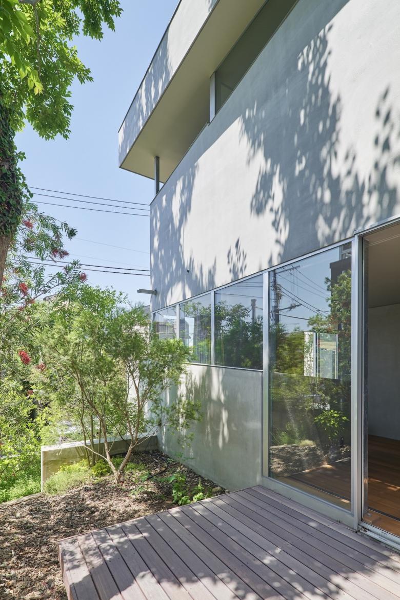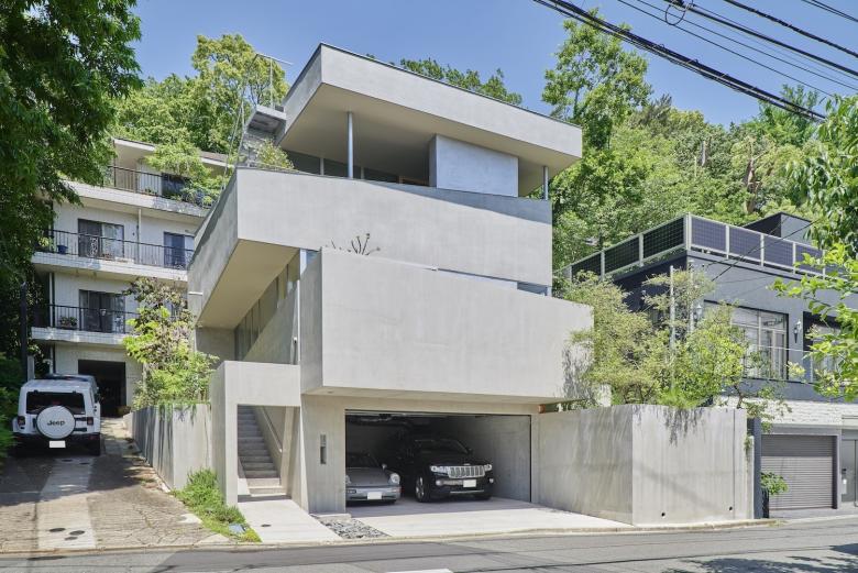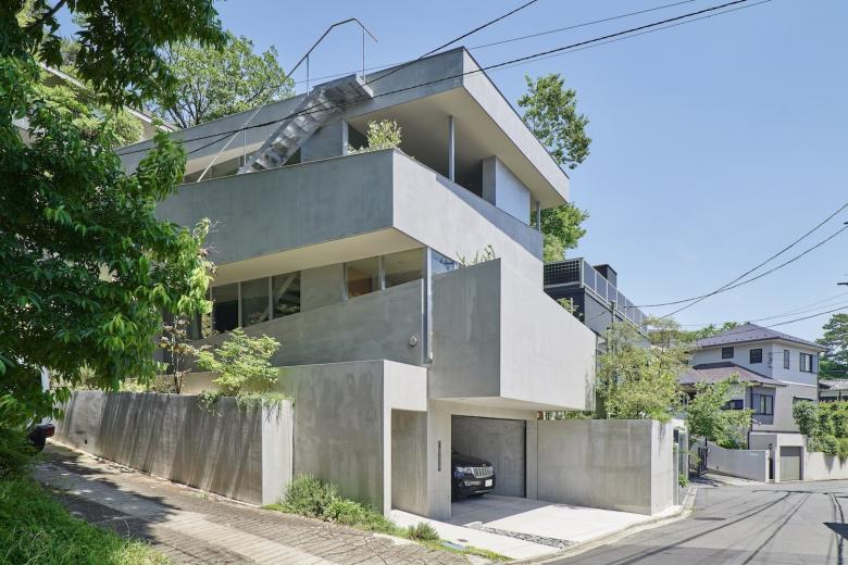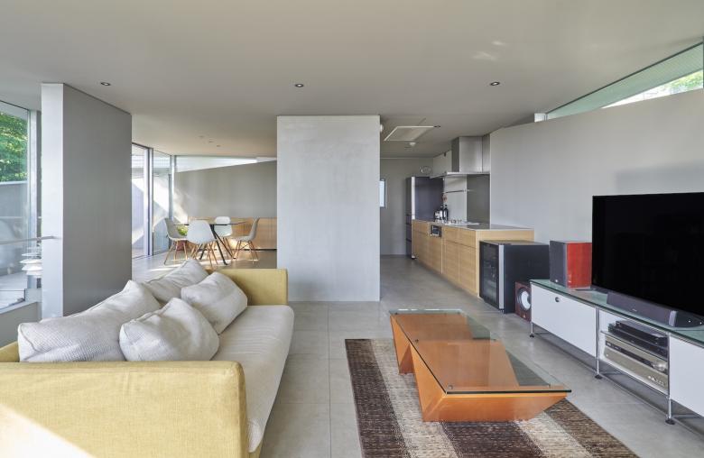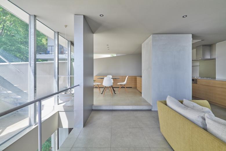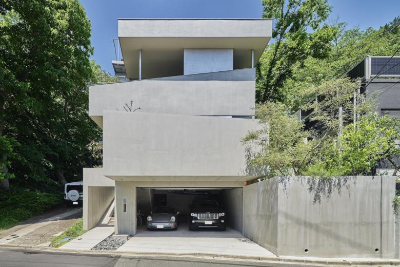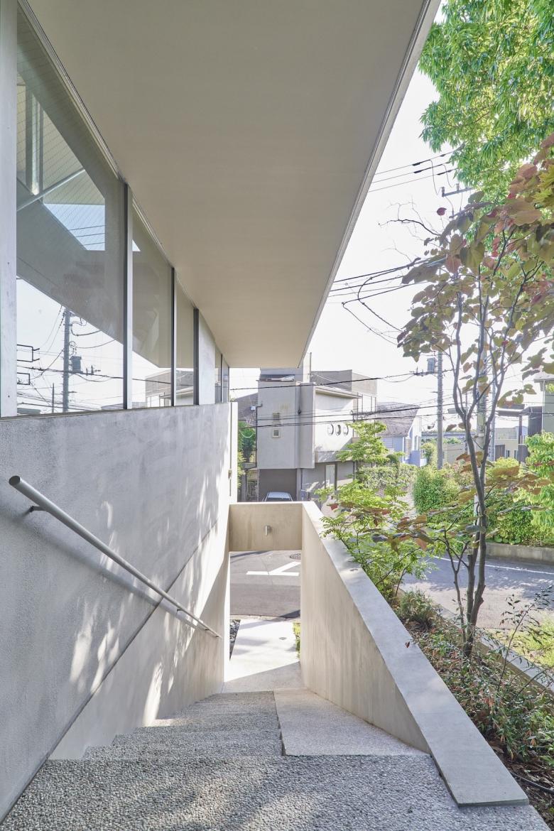 Located on a river terrace along the Kokubunji cliff line, the site is surrounded on three sides by a natural forest (Seijo Mitsuike Green) on a sloping site. Fuji to the west. The project was planned in a location close to the city center, surrounded by greenery and blessed with a view of the city. Because of the slope, the first half of the building is a concrete wall structure covered with soil, and the upper two stories are mainly a wooden and steel frame structure to connect the living space with the blessed environment outside. The location of the building, adjacent to a forest but also in a residential area, was a unique feature of the site, and it was necessary to simultaneously “open” and “close” the building to the surrounding environment. The process began with finding the appropriate height of the hip wall that surrounds the living space to cut off the line of sight from the surrounding houses and the road in front of the building, while at the same time ensuring a sense of openness to the natural environment. The height of the hip wall is a simple downward and upward slope for each floor, and by drawing a sloping ridge line that crosses the corner of the square plane, the artificial planar orientation of the land and building is given a displacement. Furthermore, by shifting the volumes of the overlapping upper and lower floors and the roof without aligning them, we weakened the edge of the interior area, which is strengthened by the waist wall.