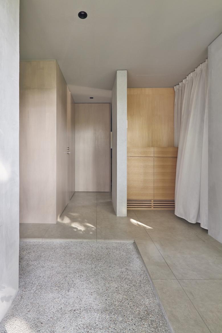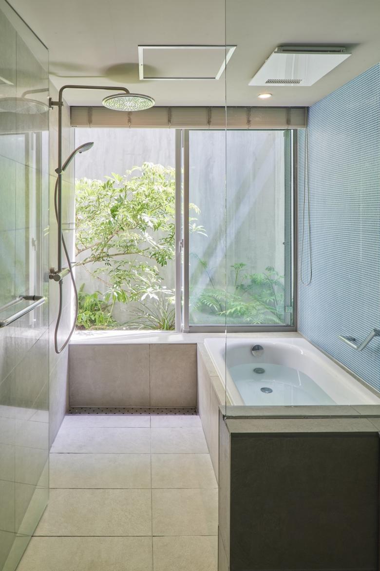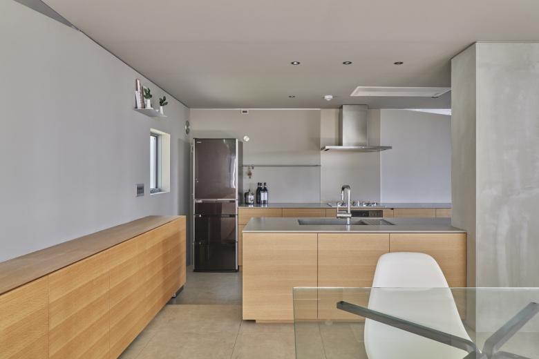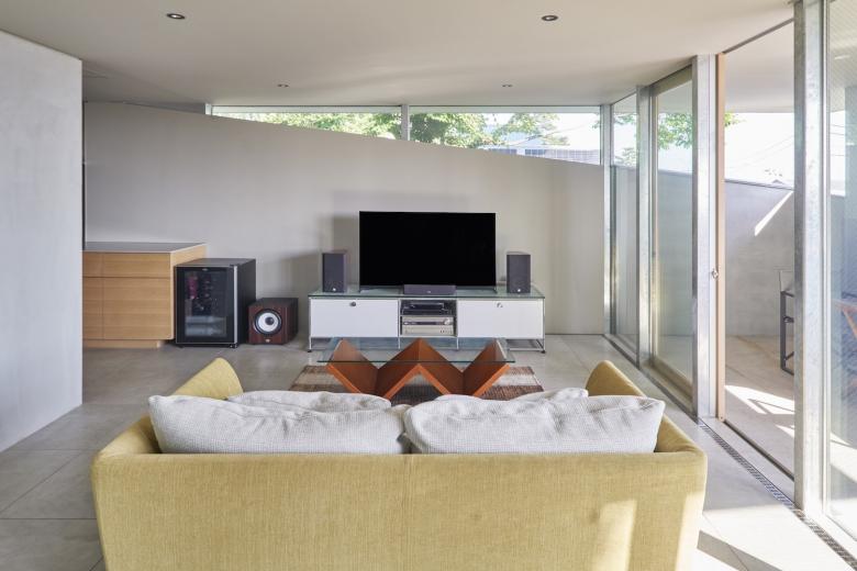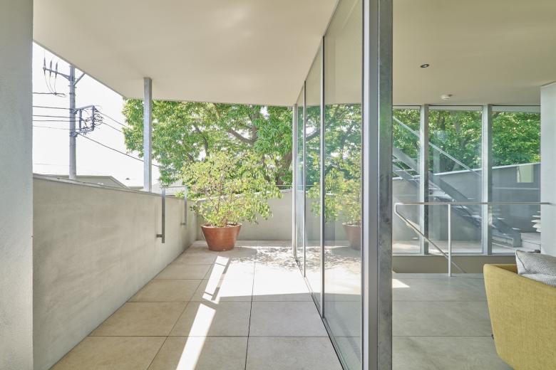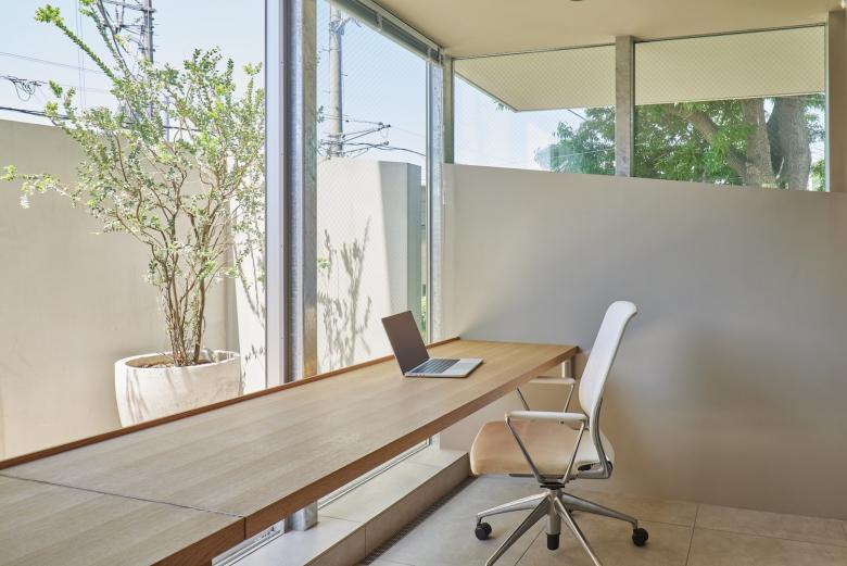 Located on a river terrace along the Kokubunji cliff line, the site is surrounded on three sides by a natural forest (Seijo Mitsuike Green) on a sloping site. Fuji to the west. The project was planned in a location close to the city center, surrounded by greenery and blessed with a view of the city. Because of the slope, the first half of the building is a concrete wall structure covered with soil, and the upper two stories are mainly a wooden and steel frame structure to connect the living space with the blessed environment outside. The location of the building, adjacent to a forest but also in a residential area, was a unique feature of the site, and it was necessary to simultaneously “open” and “close” the building to the surrounding environment. The process began with finding the appropriate height of the hip wall that surrounds the living space to cut off the line of sight from the surrounding houses and the road in front of the building, while at the same time ensuring a sense of openness to the natural environment. The height of the hip wall is a simple downward and upward slope for each floor, and by drawing a sloping ridge line that crosses the corner of the square plane, the artificial planar orientation of the land and building is given a displacement. Furthermore, by shifting the volumes of the overlapping upper and lower floors and the roof without aligning them, we weakened the edge of the interior area, which is strengthened by the waist wall.