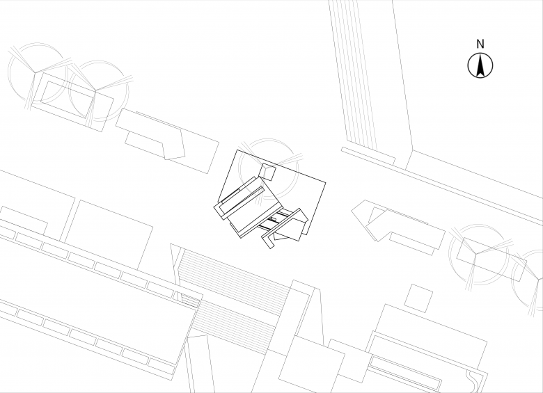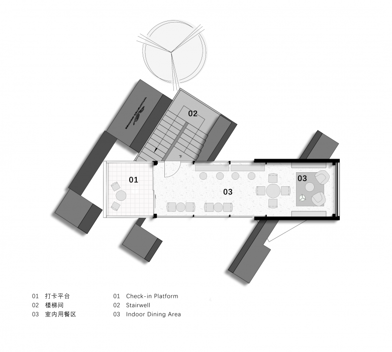 The external staircase is embedded at an angle in the gap between two walls, embodying the spatial narrative of upward exploration through cracks. Structurally, an additional horizontal steel frame installed on top of the original container secures the staircase to the main building, while also serving as a rain shelter. Air conditioning outdoor units are concealed within this frame to prevent equipment exposure from compromising facade integrity, thus achieving an integrated design that unifies structure, function, and aesthetics.