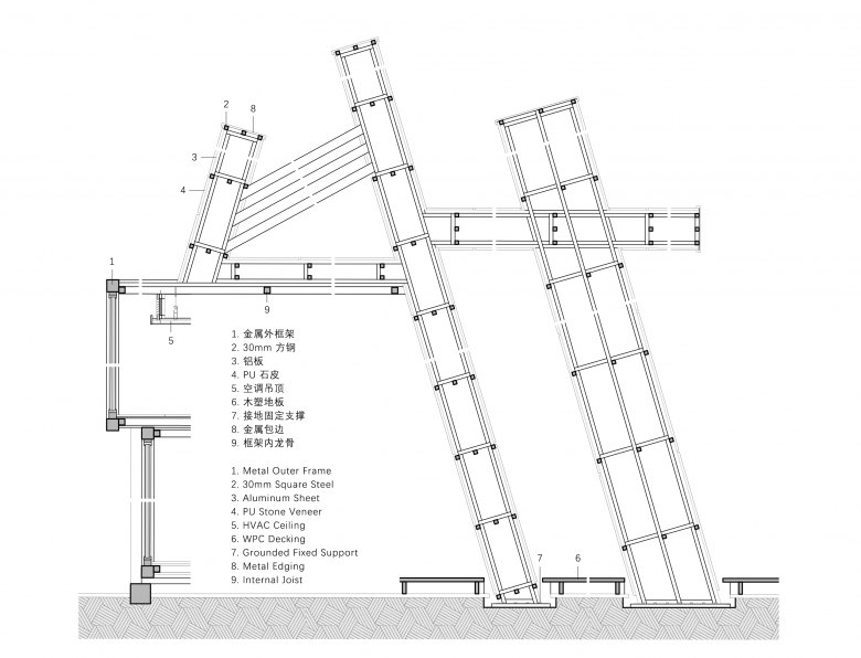 The three slanted wall panels serve as the core medium for expressing the design theme, constructed following the technical logic of frame-base-skin: first, a slanted frame is built with 30mm square steel to ensure structural stability; next, aluminum panels are applied as the base layer for PU stone veneers, providing a flat, firm surface for veneer installation while enhancing the overall rigidity of the panels; finally, 600*1200mm PU stone veneers are laid and finished with silver aluminum trim. The rough texture of the stone veneers interweaves with the sleek luster of the metal, which not only improves the building’s weather resistance and functionality but also conveys the brand’s core value of being free-spirited yet resilient through sophisticated craftsmanship details.