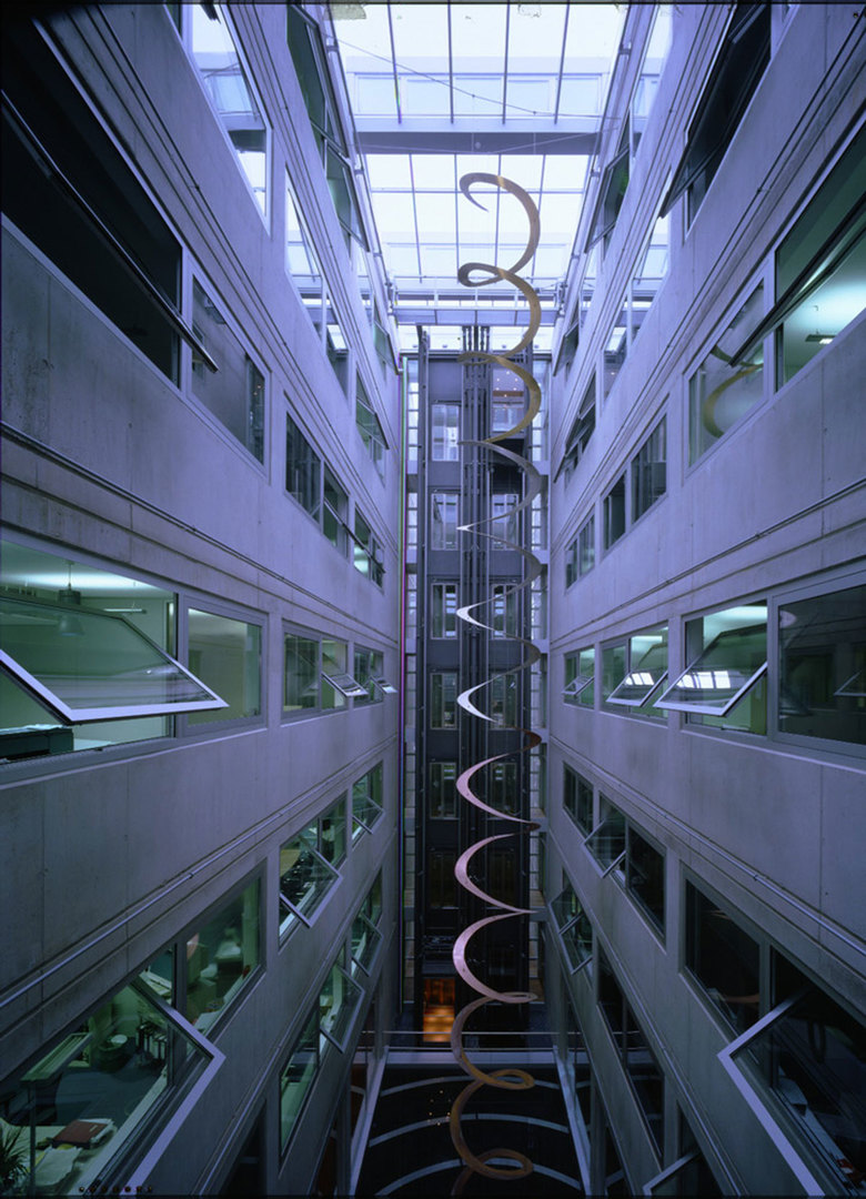 Die zylindrische Geometrie der Einzelbaukörper und ihre Transparenz beziehen diesen Raum in das Architekturkonzept mit ein.