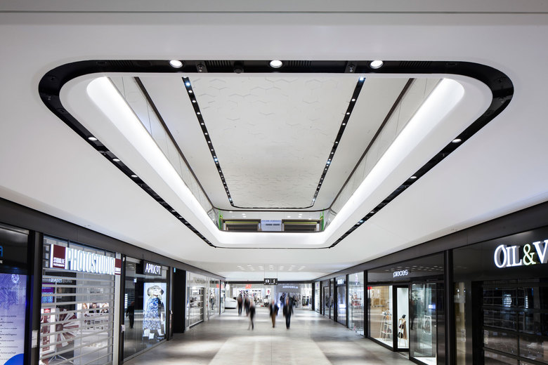 Das Lichtkonzept ist geprägt von Klarheit, Kontrast, Leichtigkeit und minimalistischen Details. Wie wird ein 1m hohes Deckenpaket leicht? In enger Zusammenarbeit mit den Innenarchitekten wurden zwei wesentliche Details entwickelt: Ein Streiflicht umsäumt die raumprägenden Deckenöffnungen mit einem markanten Lichtverlauf; schwarze, in die Decken zurückversetzte Kanäle nehmen alles auf, was ein Mall-Deckenbild in der Regel visuell belastet: Lüftung, Kameras, SI-Beleuchtung, Lautsprecher und last but not least, die Beleuchtung! Schwenkbare HIT-Strahler erhellen die öffentlichen Flächen mit einem punktuellen Rhythmus der zum Flanieren einlädt (LED's waren zum Planungsbeginn nicht leistungsstark genug). Das druckvolle, punktuelle Licht (mittels Wabenraster entblendet) schafft bewußt einen Gegenpol in der vom "Ambient Light" geprägten Gesamt-Licht-atmosphäre der unterschiedlichen Shopkonzepte. In regelmäßigen Abständen integrierte, schwarze Stromschienen in den Kanälen können bei Veranstaltungen und Präsentationen mit zusätzlichen Strahlern ausgestattet werden.