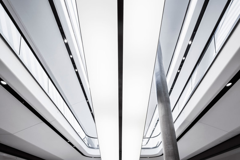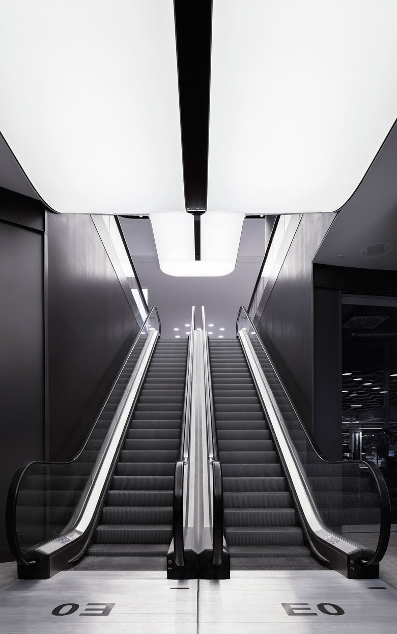 Weitere Highlights und "Big-Lights" sind die homogen leuchtenden Untersichten der Fahrtreppen; deren schwarze Fugen korrespondieren mit den Licht-/Technikkanälen, den Handläufen der Fahrtreppen und Brüstungen, mit den grauen Fassadenprofilen der Shops. Die so erzeugten Kontraste sind kein Zufall. Sie waren ein klares Ziel der Licht- und Interiordesigner. Ein dreidimenisonales, grafisch strenges Gesamtkonzept das bestehen kann neben der Viefalt der unterschiedlichen Geschäfte, Farben und Identitäten.