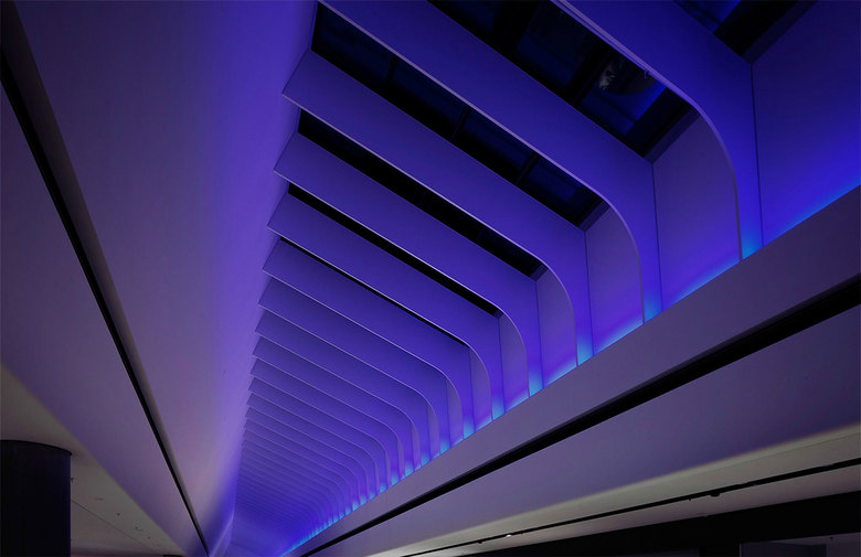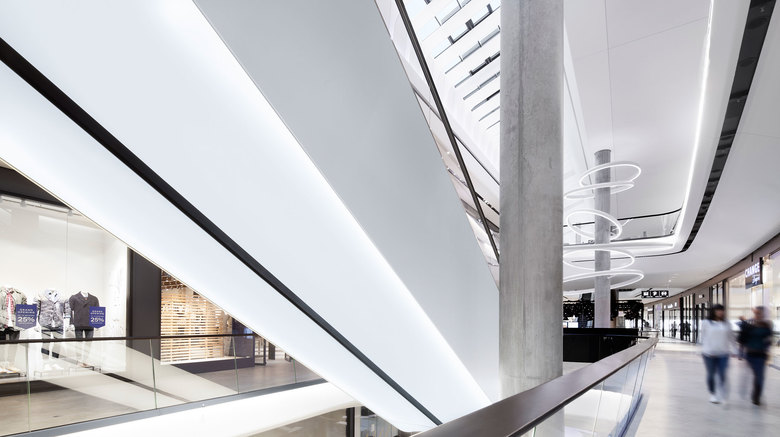 Ein großzügiges Oberlicht versorgt die Mall mit viel gutem Tageslicht. Die Konstruktion nimmt sich dank speziell gestalteter Lamellen zurück. Sie wird erst sichtbar wenn der Betrachter senkrecht nach oben blickt. Mit Einbruch der Dunkelheit verwandelt sich das gesamte Oberlicht durch indirekt platzierte, lineare LED-Profile (nur blau, kein RGB) in ein magisches, blau leuchtendes Lichtobjekt. Das blaue Licht erzeugt einen wunderbaren Farbkontrast zur warmweiss geprägten Gesamtatmosphäre.