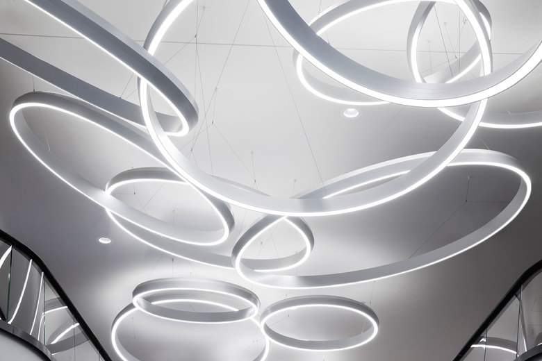 Mit drei Eingängen auf zwei Ebenen spiegelt das Gebäude die komplexe urbane Situation wieder, in die es eingefügt wurde. Im Sinne eines ganzheitlichen Erscheinungsbildes entwickelten die Innenarchitekten und Lichtdesigner für alle Eingänge das Thema der "Ringe". Insgesamt 31 LED-Ringe wurden speziell für das Projekt entworfen und angefertigt. Im EG mit geringer Raumhöhe, eingebaut in die Decke, im 1. und 2.OG aus großer Höhe abgependelt sorgen sie für spektakuläre Entrées. Als Ergänzung zu den Eingängen "tanzen" 10 Ringe in unterschiedlichen Größen ("Hoola Hoop") frei um eine Stütze im Zentrum der Mall, über die gesamte Raumhöhe der drei Geschosse. Sie spiegeln sich in den Wasser-flächen des Brunnens, den zentralen Treffpunkt der Mall. Die Ringe dieses Objekts sind mit RGB-Systemen ausgestattet, um Events oder besondere Anlässe mit farbigen Licht zu unterstützen.