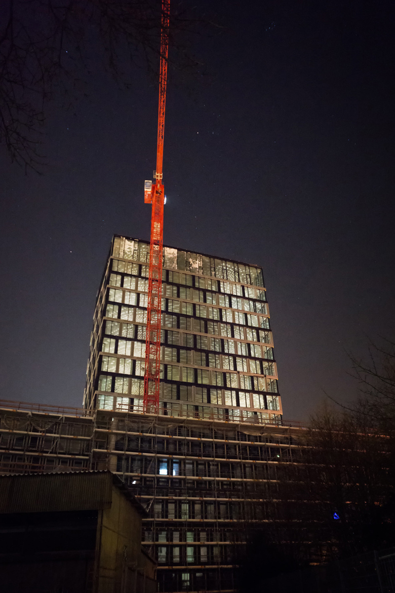 Das „HighRise one“ ist ein Hochhaus mit 17 Stockwerken, welche ausschließlich mit Büroflächen belegt sind. Noch vor Fertigstellung des Gebäudes wurde von den Architekten und dem Bauherrn der Kontakt mit den Lichtplanern gesucht, um eine Lichtidee für die Nacht am 19. Januar 2017 zu entwickeln. Da das Bauwerk bereits mit einer Fassade verkleidet, der Innenraum aber noch leer und roh belassen war, bot es ideale räumliche Bedingungen, um eine besondere Lösung zu realisieren, sowohl für die „Lange Nacht“ als auch die PR-Arbeit für den Verkauf des Gebäudes.