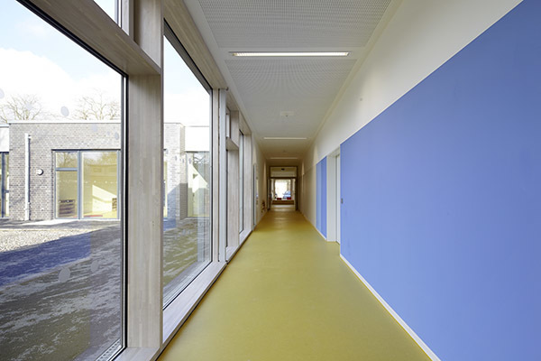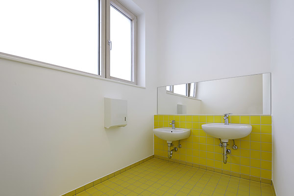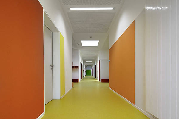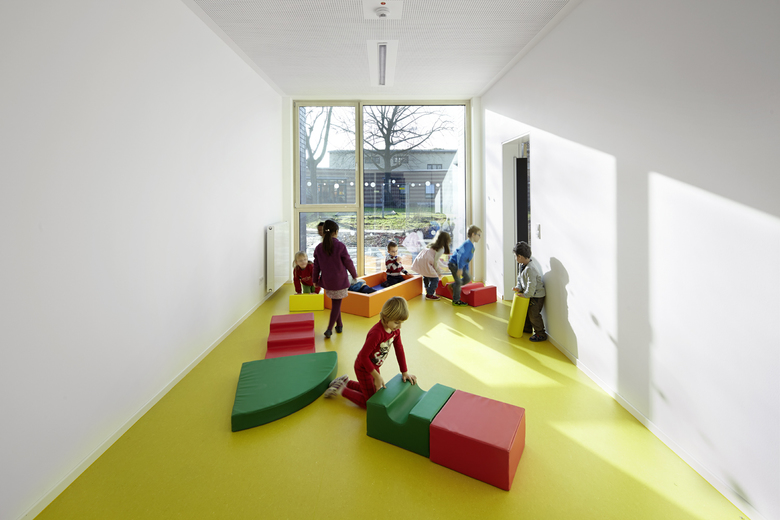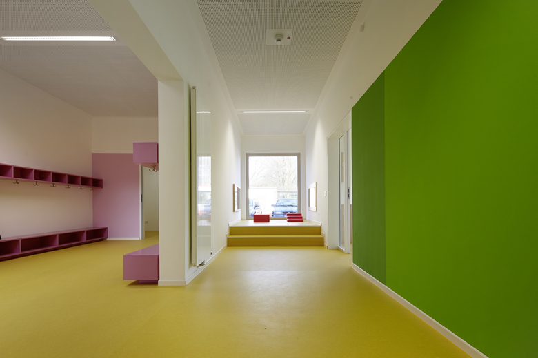 Gebaute Pädagogik. – Durch den Erweiterungsbau entsteht draußen ein Hof zum Spielen und Toben. Drinnen erschließt eine Spielstraße das Gebäude. Den Gruppenräumen ist jeweils ein Vorplatz zugeordnet. Lichtbänder neben den Türen ermöglichen Einblicke. Jede Gruppe hat einen direkten Hofzugang. Ein kindgerechtes Farbkonzept organisiert die Räumlichkeiten, das Mobiliar ist auf kleine und größere Kinder eingerichtet. Hier leben Kinder ihre Selbstständigkeit aus. Die komplette Glasfassade zum Innenhof bringt natürliches Licht ins Innere, genau wie Oberlichter. Das Energiekonzept wurde maximal optimiert, 3-Fach-Verglasung, Präsenzmelder, Tageslichtsteuerung und Fernwärme inklusive.
