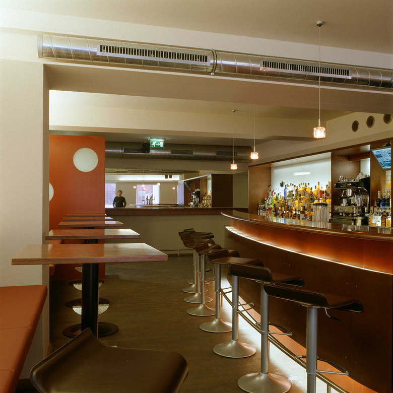 Über eine in den Raum gestellte Box, die als Windfang dient, gelangt man in das Lokal. Eine bumerang-ähnlich geschwungene Bar bildet das zentrale Möbelelement im L-förmigen Gastraum. Gefertigt aus Schiffsbausperrholz schwebt der Bumerang quasi durch das Lokal. Ein unter der Theke laufendes Lichtband betont die Dynamik des Schwunges.