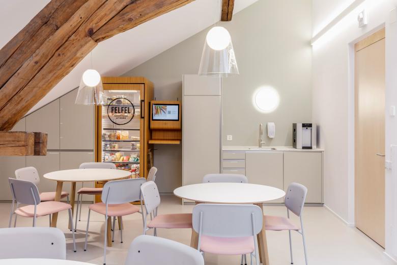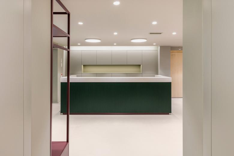 Das neue Gesundheitszentrum Rorschach von HOCH Health Ostschweiz – es befindet sich in den oberen beiden Geschossen eines umgenutzten Gebäudes – umfasst die Bereiche Onkologie, Kardiologie, Gastroenterologie und Urologie. Bei der Gestaltung der Praxisräume ging es unter anderem darum, ein passendes Farbkonzept zu entwickeln, das den Patienten ein positives und wohlbehütetes Gefühl vermittelt. Wände und Decken der Praxisräume sind hauptsächlich in Weiss gehalten, der fugenlose Gussboden mit Korkanteil ist in einem warmen Hellgrau-Beige ausgeführt. Ergänzend dazu setzt ein harmonischer Vierklang aus Rosé, Bordeaux, Hell- und Dunkelgrün frische Akzente und unterstützt zugleich bei der Orientierung. Kombiniert wurde dazu naturlackiertes Birkenholz, das bei den Türen, bei den Verkleidungen der Radiatoren sowie bei den Möbeln zum Einsatz kam.